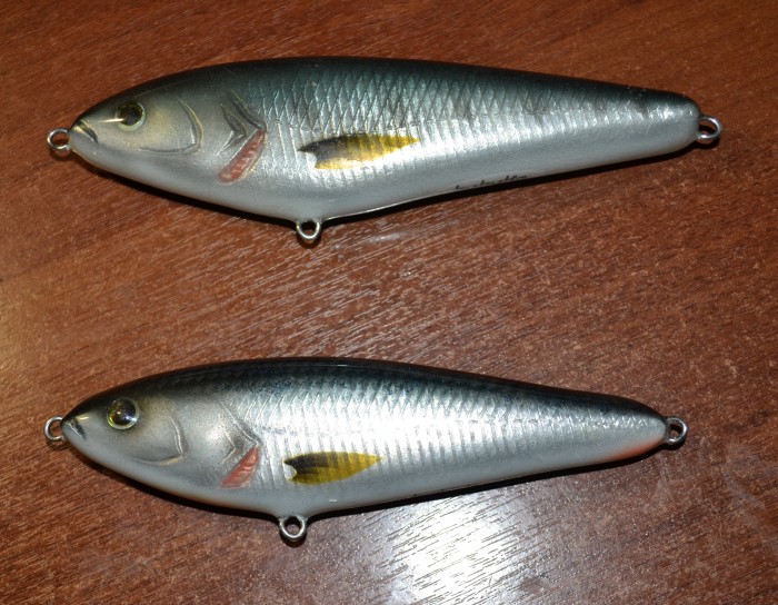 Наконец то занялся обновками, есть куча мыслей на сезон, лишь бы хватило времени всем половить :D За этим дайвером гонялся больше года, и наконец срослось... и вот у меня в руках LEVIATHAN 10 " современная реплика на американскую классику джеркбейтов Dive and Rise, от Lee Lures Custom Baits. Давно почитаю Ли Таучена как охотника за трофейными маскинонгами и продвинутого в этом деле мастером приманок. LEVIATHAN имеет весьма не простую в изготовлении форму, выдержать все обводы корпуса очень не простая задача. Очень сочная покраска с серебрянными чешуйками и 4 слоя с эпоксидным покрытия. На сколько я знаю из 10 заготовок свет увидят 3-5. Малейшая не точность и приманка запилена и идет в брак. Так что цена и время производства делают ее совсем не массовой. Дайвер сделан по схеме с двумя лузами куда вкручиваются огрузочные шайбы 2 oz,1.5 oz и 1 oz, их по две штуки и можно ставить в любых вариантах в зависимости от задач.