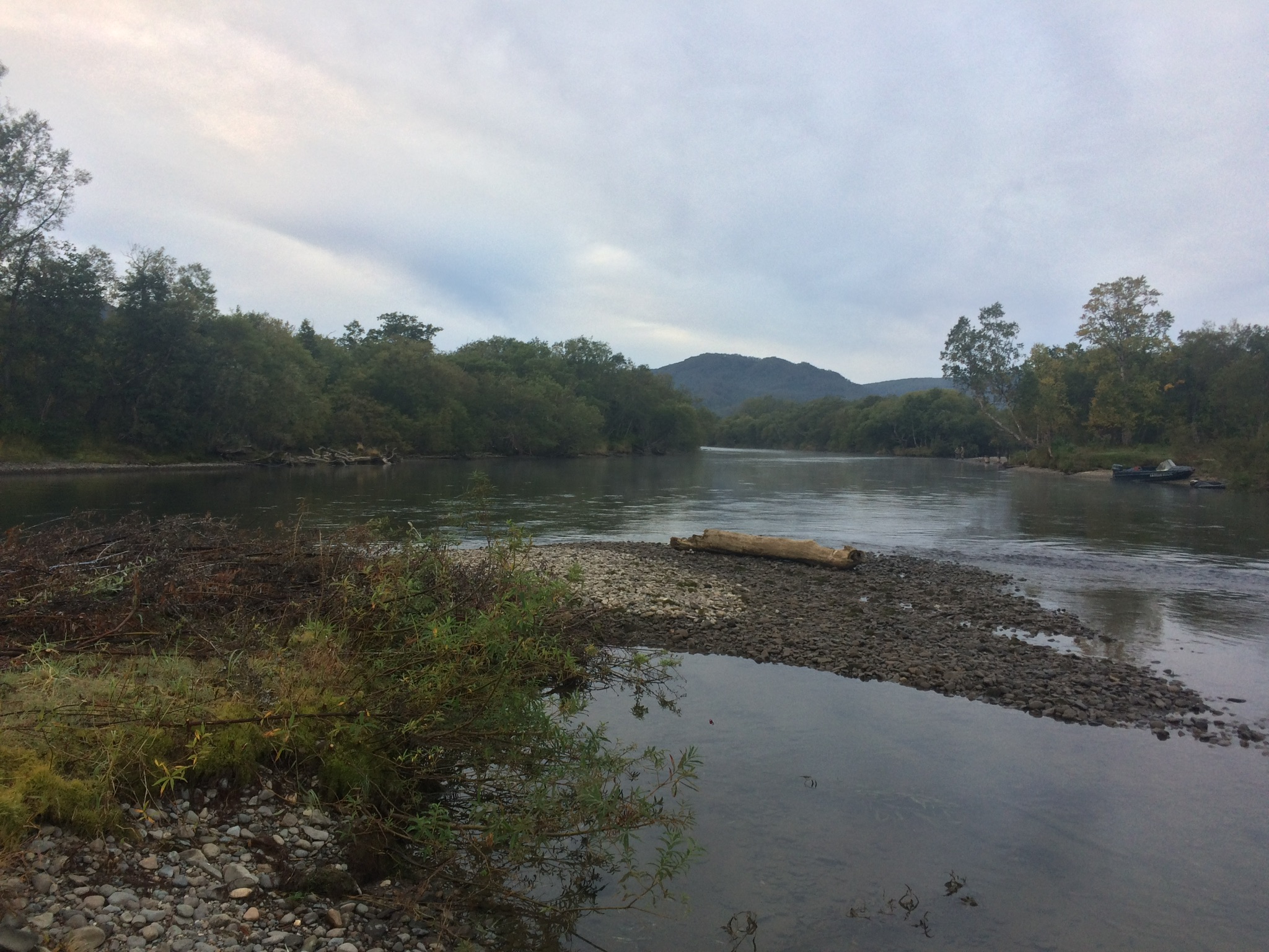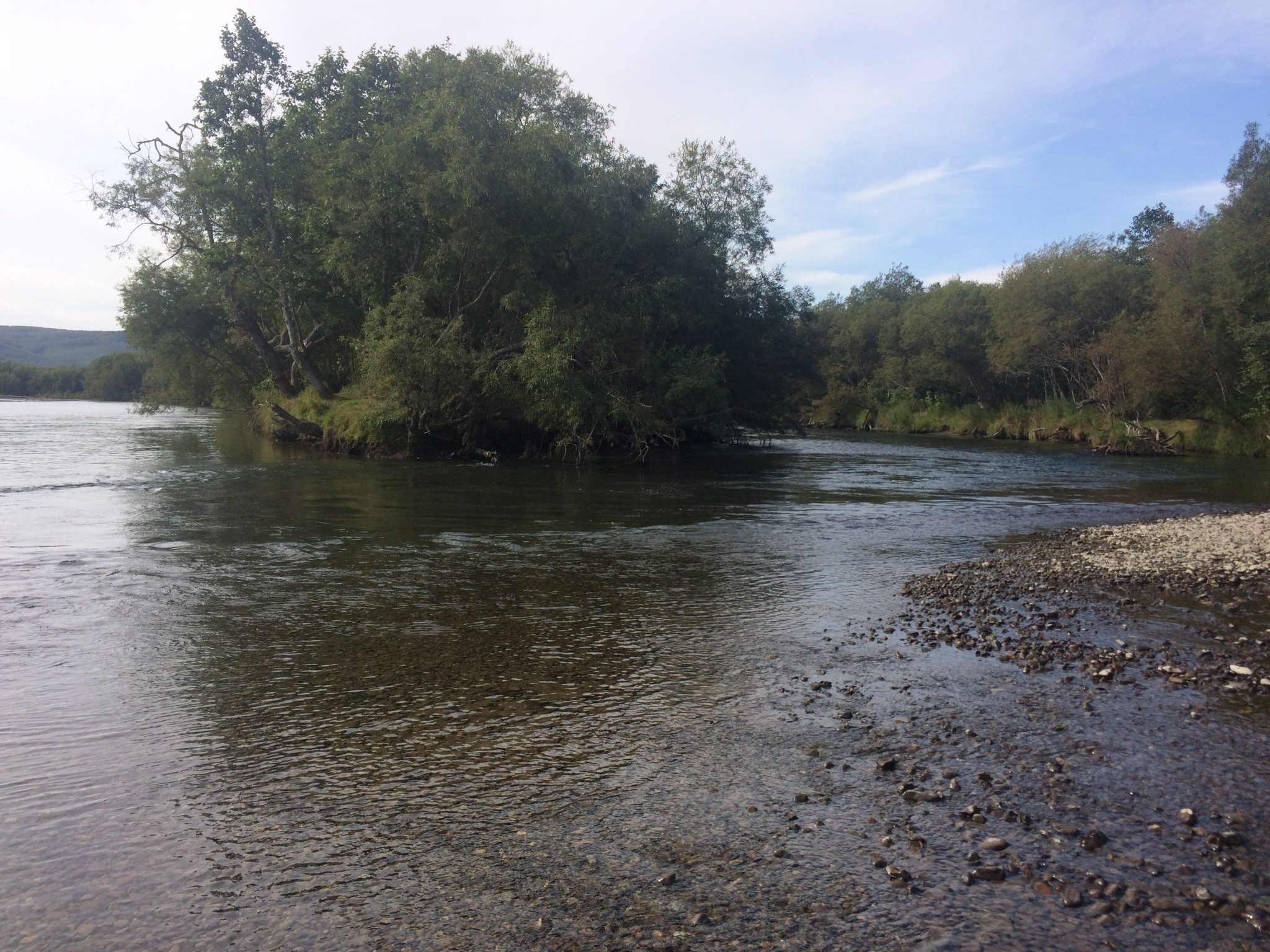 Рыба начала гулять... Уже хорошо. Местные сказали, что сейчас должна вот вот пойти кета... Нашли место - слияние основного русла и небольшого рукава со слабым течением и обраткой. Прослеживалась граница чистой и мутной воды.