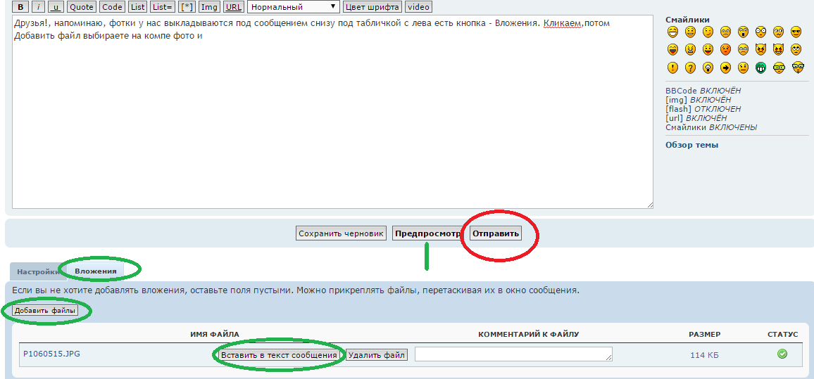Прошу обратить внимание когда ставите фотки. Многие забывают поставить их в текст и ставят как вложения. Лучше их вставлять что б инфа не стекла куда нить))) Просто после загрузки когда загорится зеленым статус что ваше фото обработано вы курсором и левой клавишей ставите рыску в любом месте вашего сообщения куда вы хотите поставить картинку и нажимаете - Вставить в текст сообщения. Таким образом вы можете фотки расставлять в любой последовательности и куда угодно. Пользуйтесь Предопросмотром, всегда увидите что на финише)