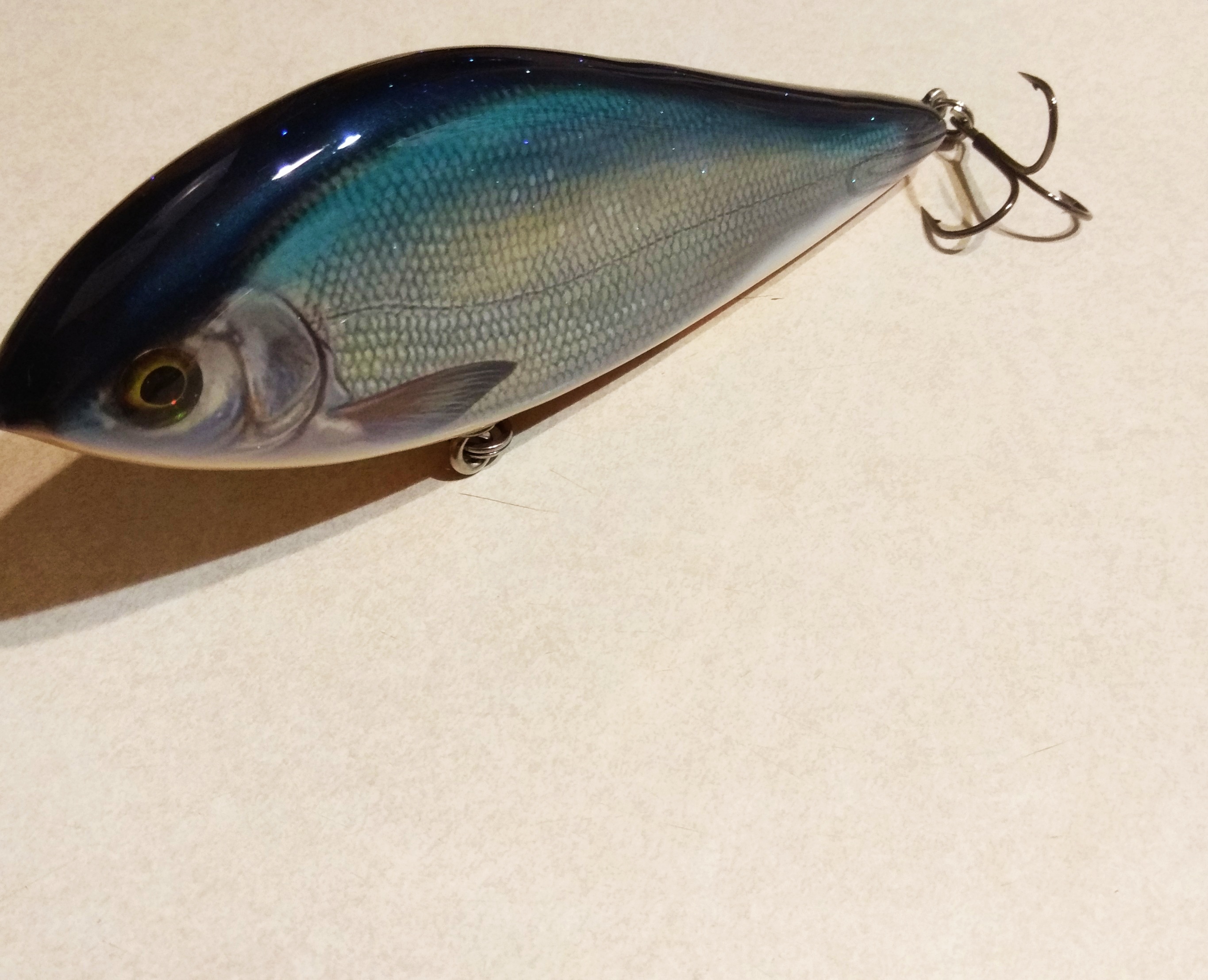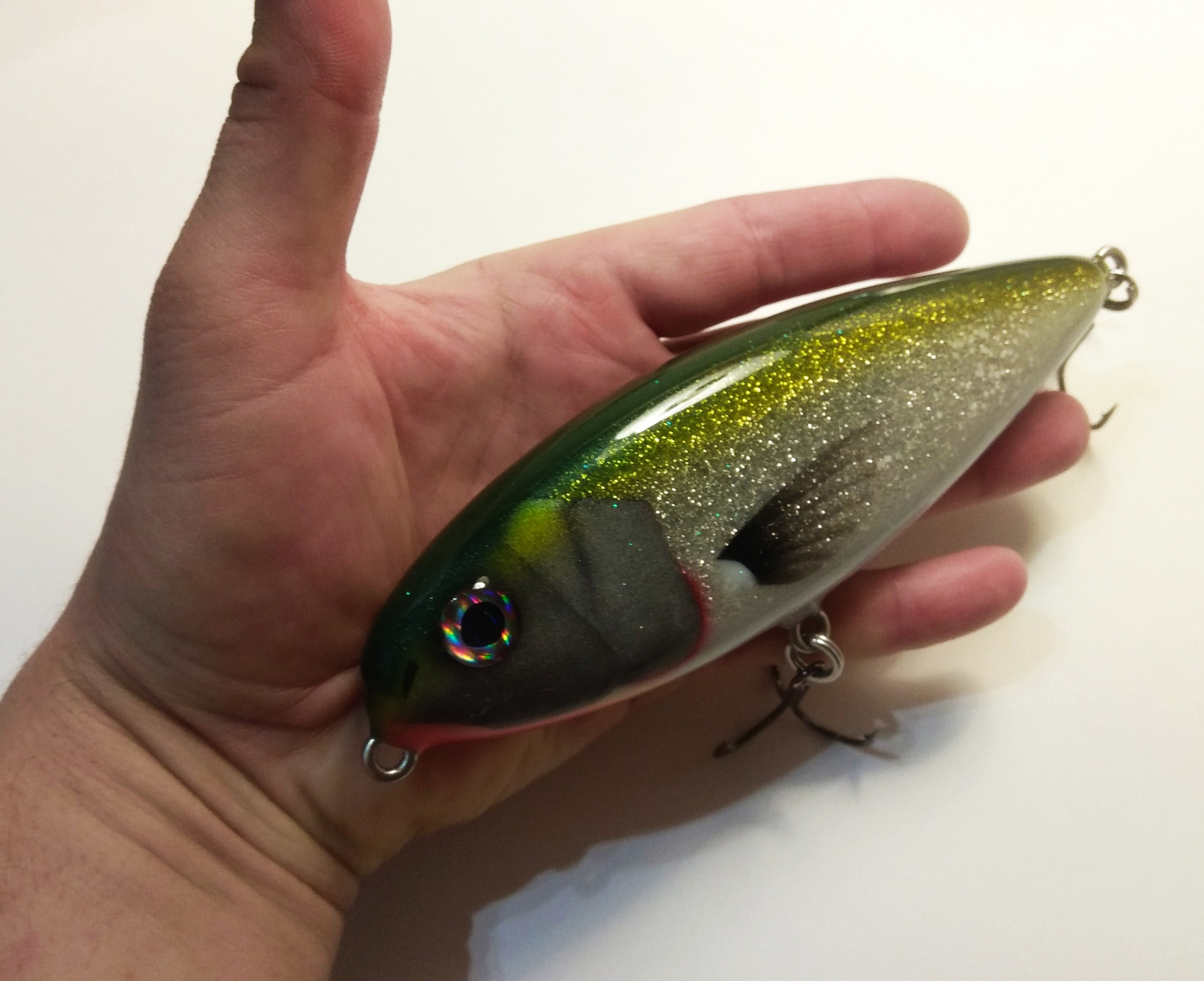 Решил делать в размере 16 см , медленно тонущий , гремящий.Жаберные крышки сделал объемными как на оригинальном джерке. Оговорюсь , джерк вышел не совсем короткоходным и вертлявым , а с глайдами средней длины. Вес джерка с тройниками Owner 2/0 - 125 гр.