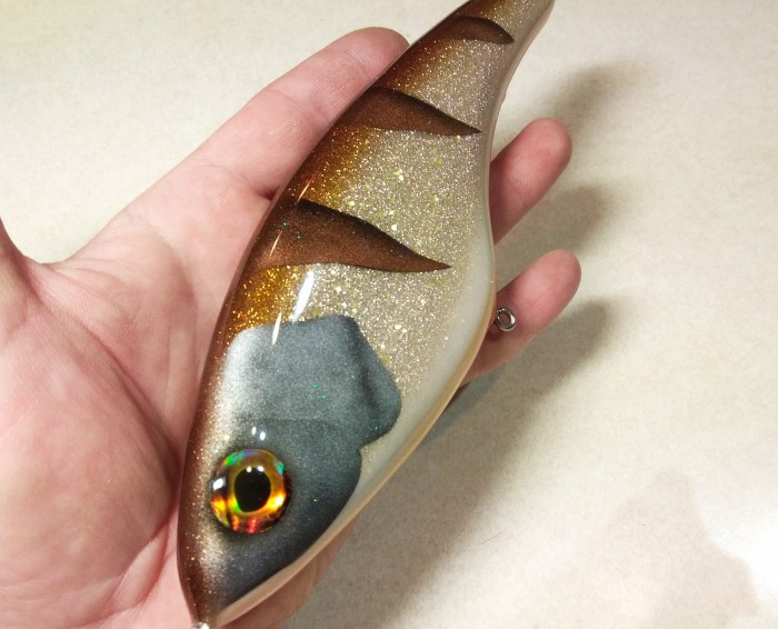 3) Окрашиваем приманку если нужно( в данном случае требовалось из-за потрепанности воблера и даже часть лопатки !) и покрываем толстым слоем лака-брони дабы защитить бальсовое тело приманки от щучих зубов.