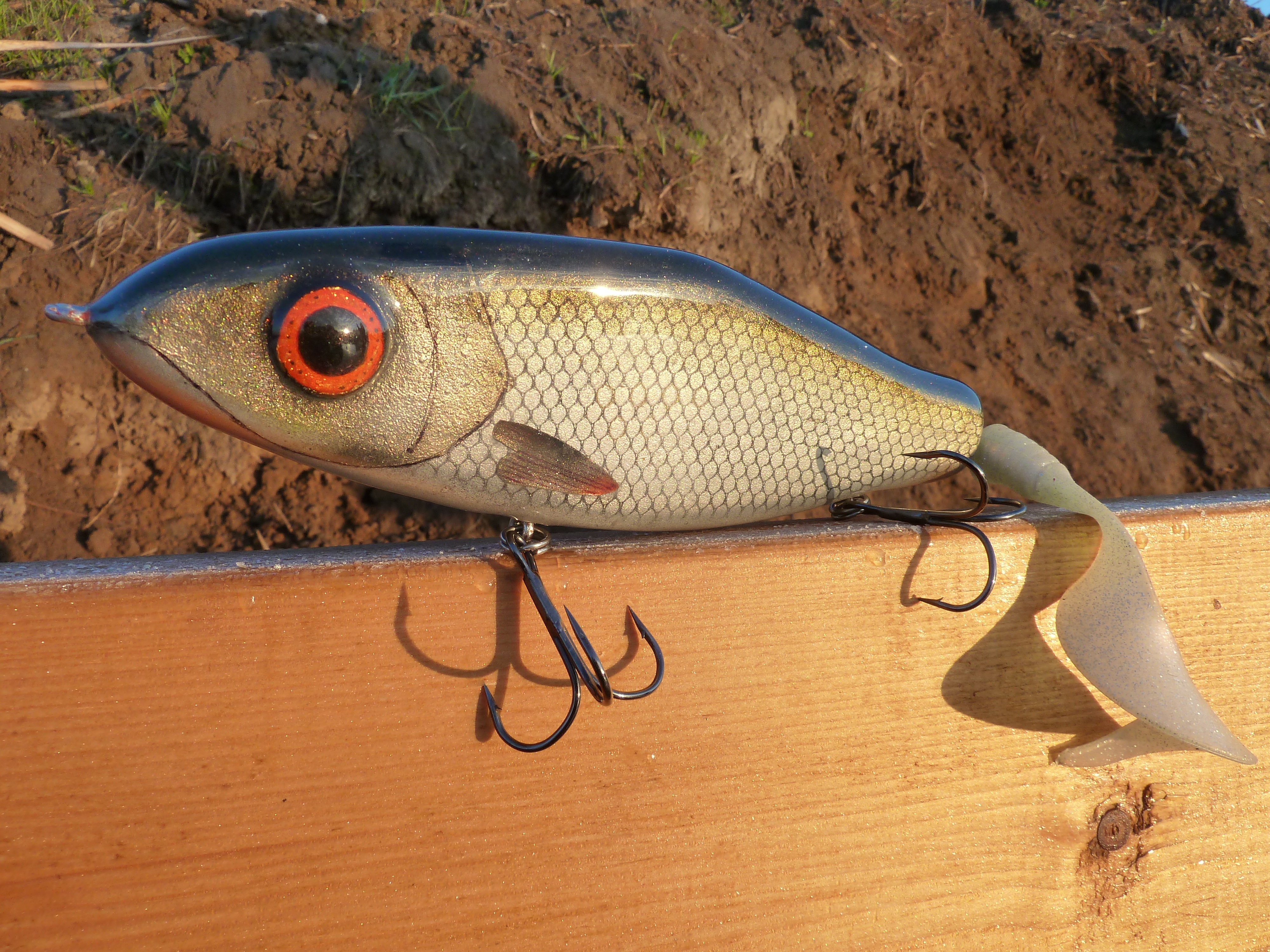 Джерк 23см, c фурнитурой 265 гр, кедр. Играет зашибись, медленно тонущий . Петлю переставил повыше , чтобы была возможность при необходимости поднять к поверхности. Пока необщучен