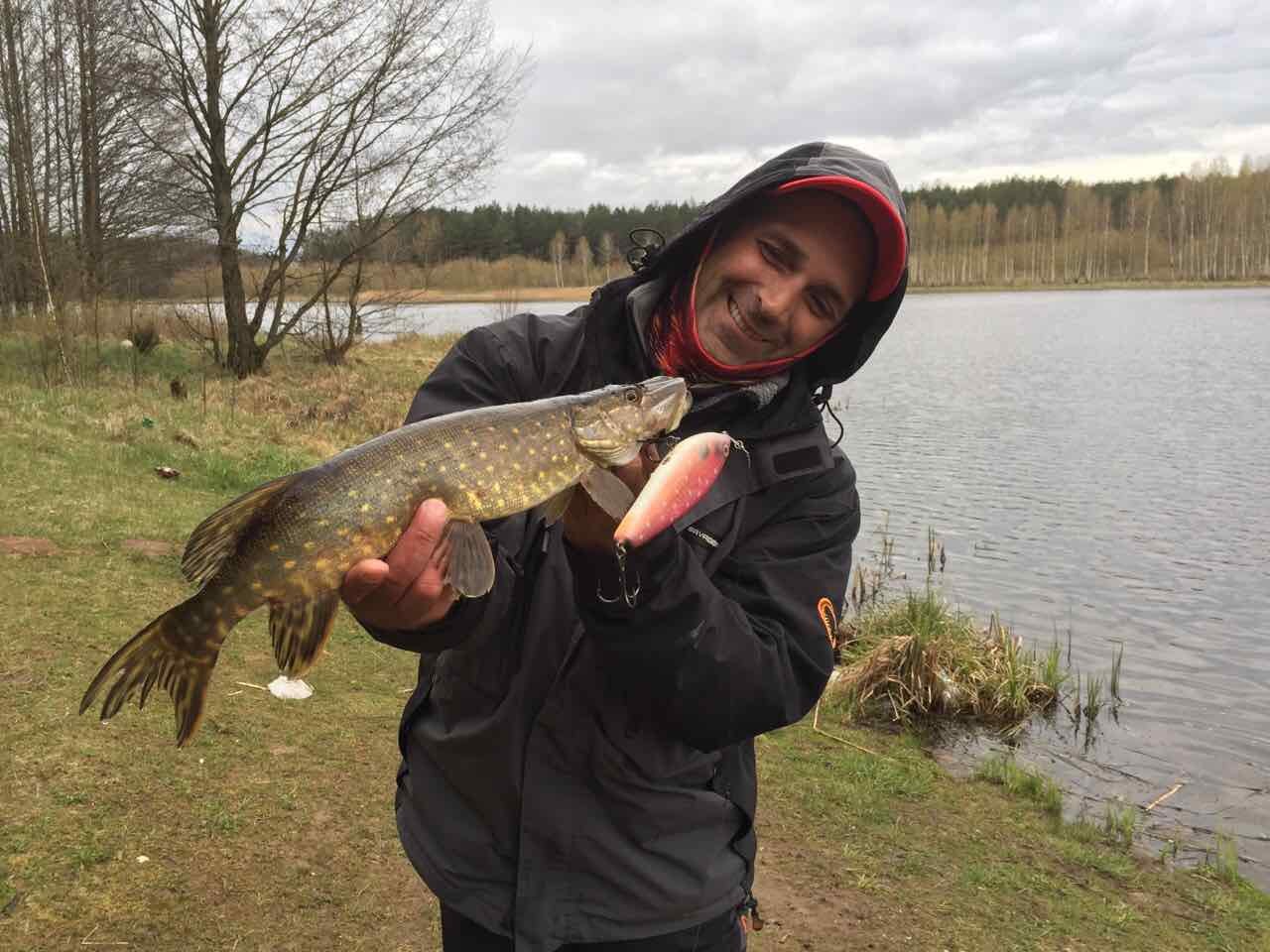 Еще меньше моей и претендует на рекорд самой маленькой браславской щуки нашего экипажа. Но ловим дальше, еще пара выходов и все. Вот уже обед мы перекусываем и оцениваем ситуацию, что поменять и куда двигаться. Я решаю проверить еще одну класическую банку, ставлю своего старого макрабера и выжу выход шнурка до лодки. Паша долавливает её на джерк через пару забросов, а я бросаю в другую сторону и бум! Кто-то сел, недолгое спокойное вываживание и вот наконец хорошая щука отдыхает в подсаке. Паша поздравляет меня