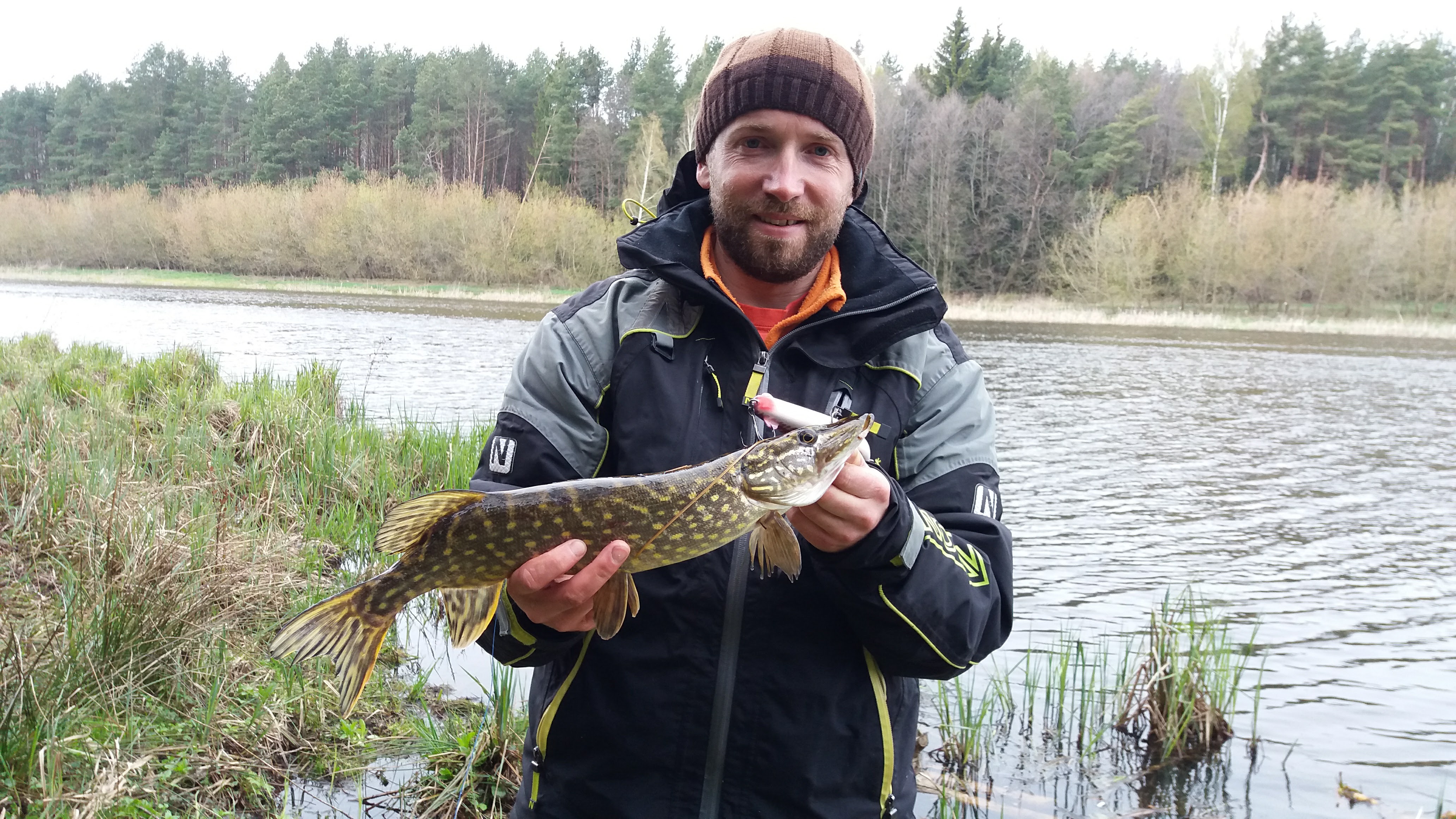 Еще меньше моей и претендует на рекорд самой маленькой браславской щуки нашего экипажа. Но ловим дальше, еще пара выходов и все. Вот уже обед мы перекусываем и оцениваем ситуацию, что поменять и куда двигаться. Я решаю проверить еще одну класическую банку, ставлю своего старого макрабера и выжу выход шнурка до лодки. Паша долавливает её на джерк через пару забросов, а я бросаю в другую сторону и бум! Кто-то сел, недолгое спокойное вываживание и вот наконец хорошая щука отдыхает в подсаке. Паша поздравляет меня