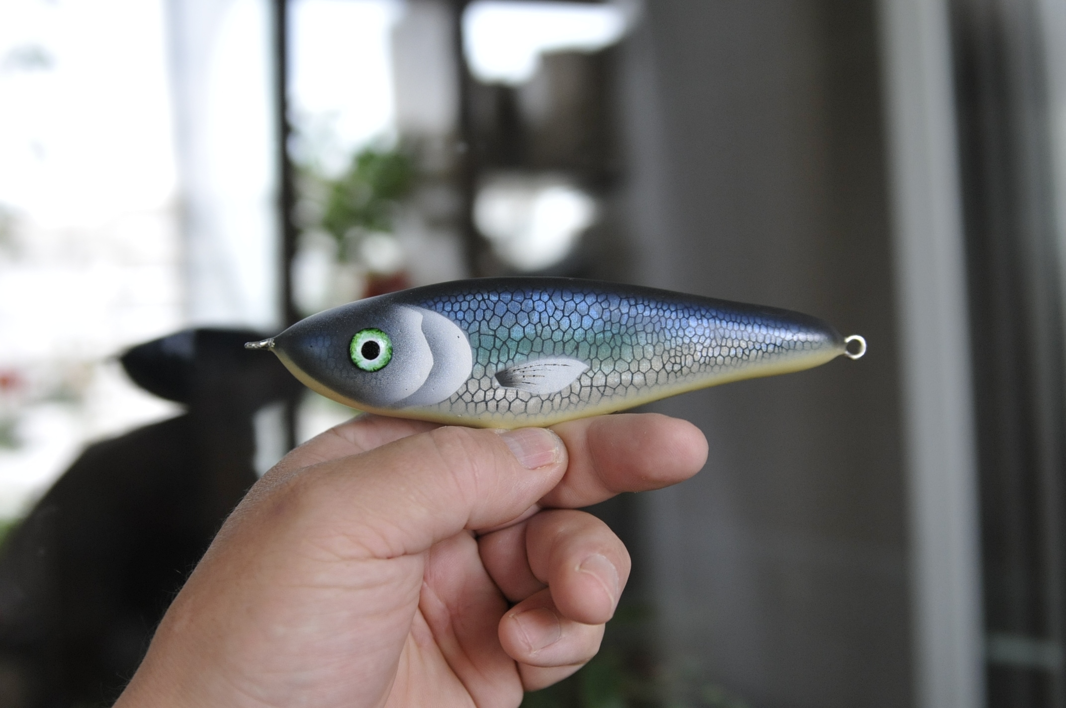 Первый был сделан 110грамовый. Ездил со мной на Иртыш только ещё не крашенным. Рыба была вся в траве поэтому половить на него не удалось. Испытал на глубинах до 4х метров. Понял что его рабочий горизонт гораздо глубже. Тонет как камень