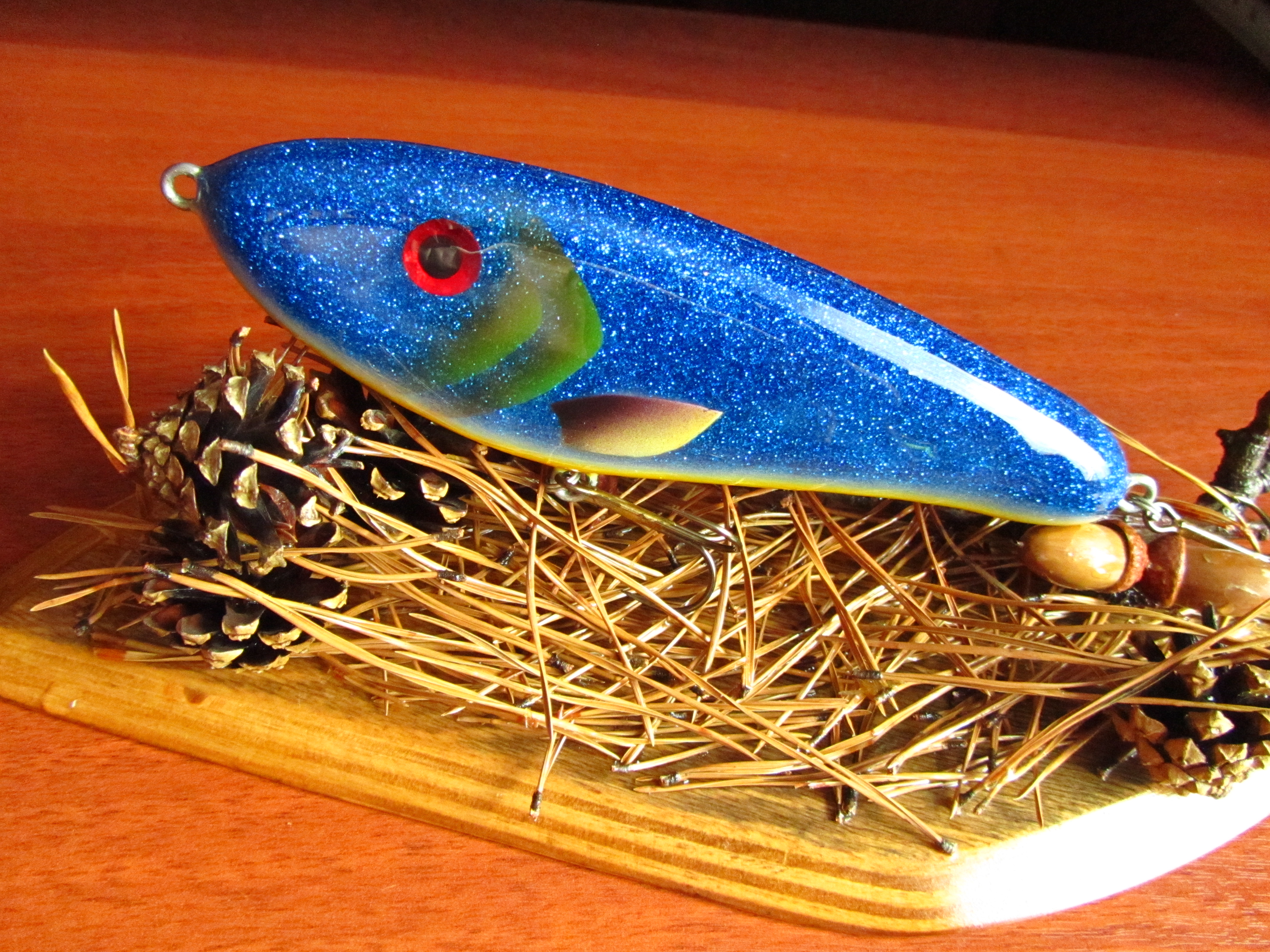 Соглашусь Дим, плавник скорее не к месту ибо крючку деваться не куда. А крючок должен стоять так что б хвост не доставал... Верхний и задний плавник отлить из пластика можно или проще вырезать из игрушек или еще чего другого. Все ж деревянный больше к экспонатной теме имхо.