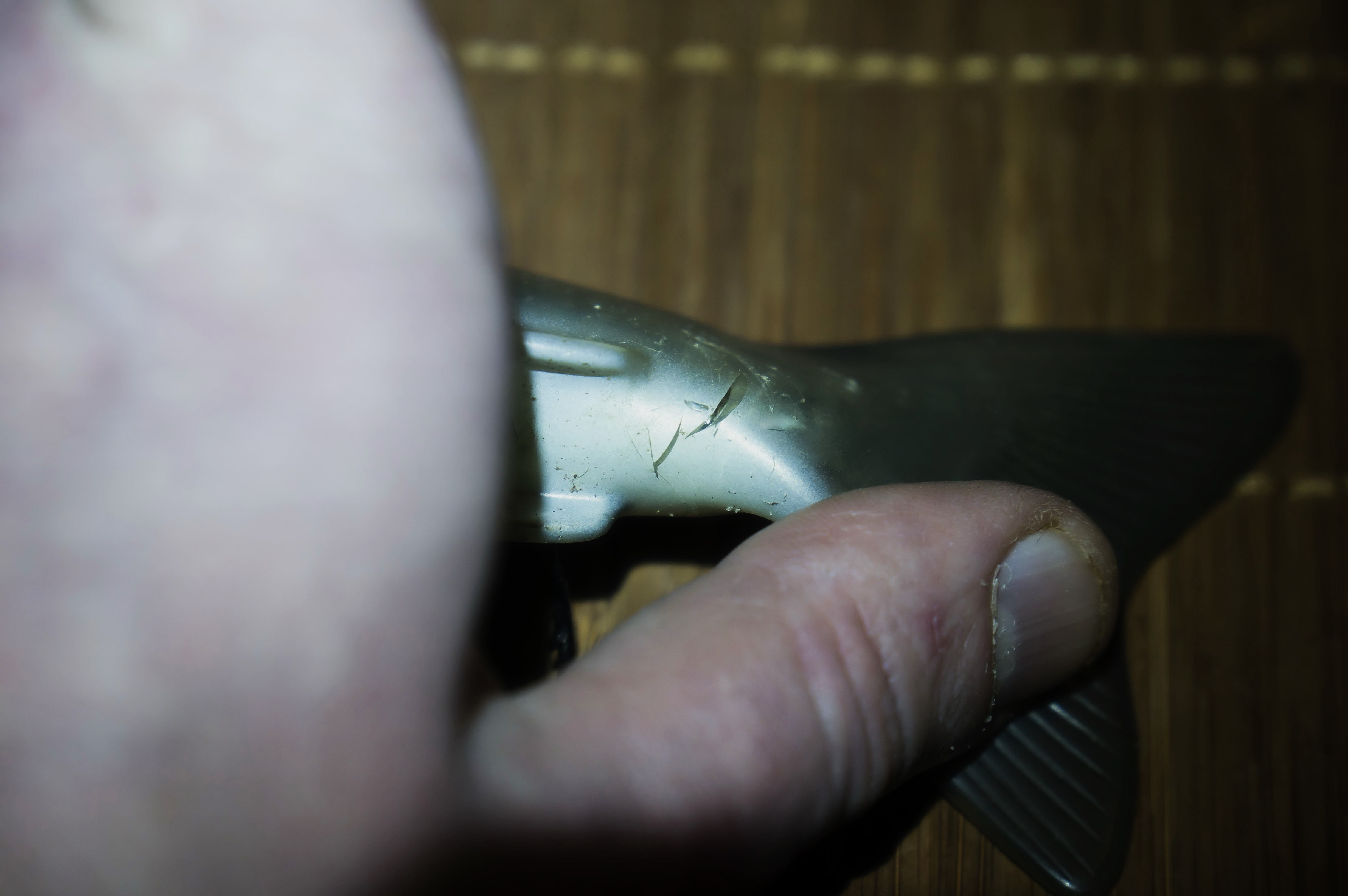 Наконец дошли руки. Более внимательный осмотр свимбейта вызвал новые и неутешительные мысли по поводу её дальнейшего использования.. Надежды на крепкое резиновое покрытие к моему сожалению не оправдались- очень много сквозных царапин! И это при поимке новой приманкой всего-то семи щук.
