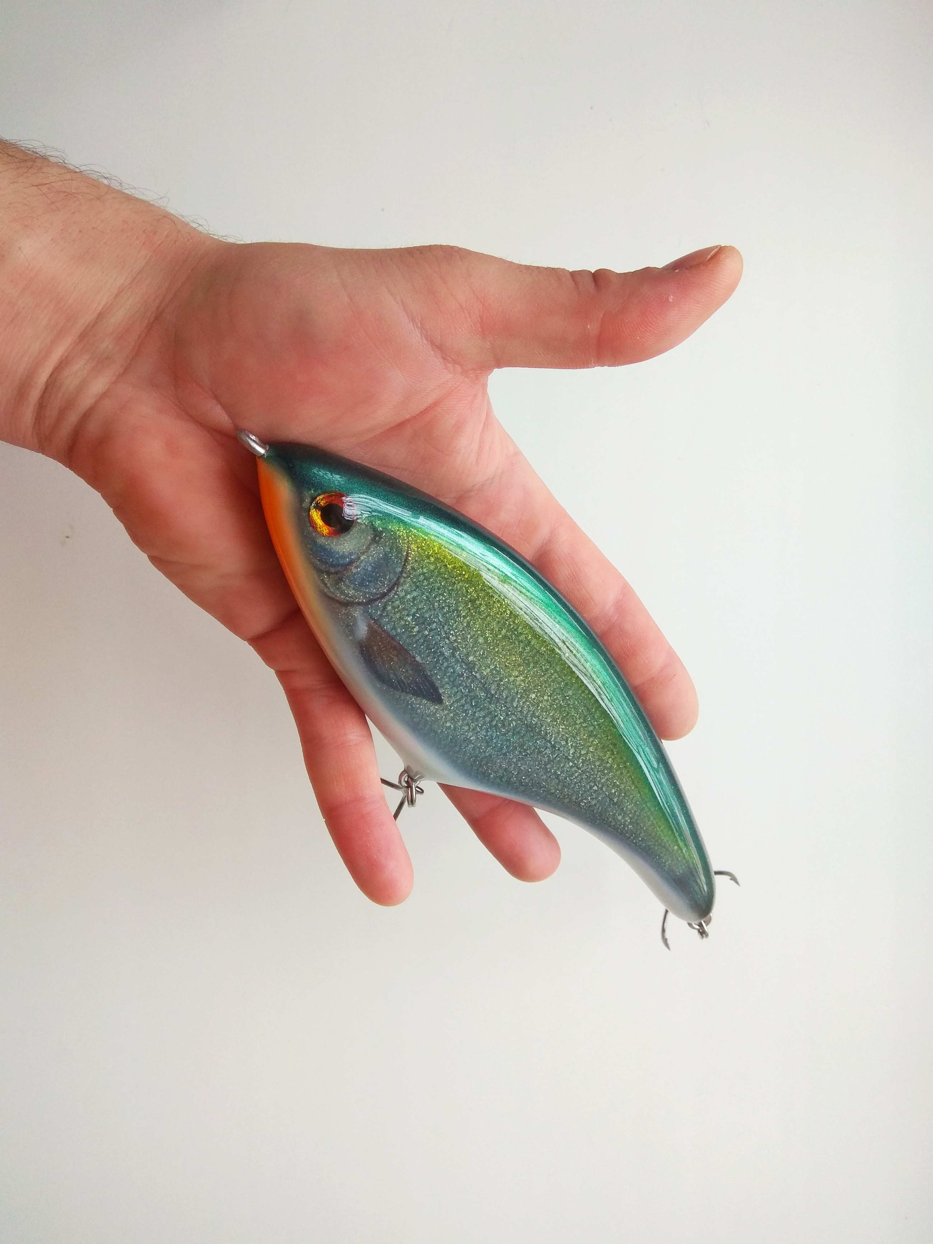 Решил делать в размере 16 см , медленно тонущий , гремящий.Жаберные крышки сделал объемными как на оригинальном джерке. Оговорюсь , джерк вышел не совсем короткоходным и вертлявым , а с глайдами средней длины. Вес джерка с тройниками Owner 2/0 - 125 гр.