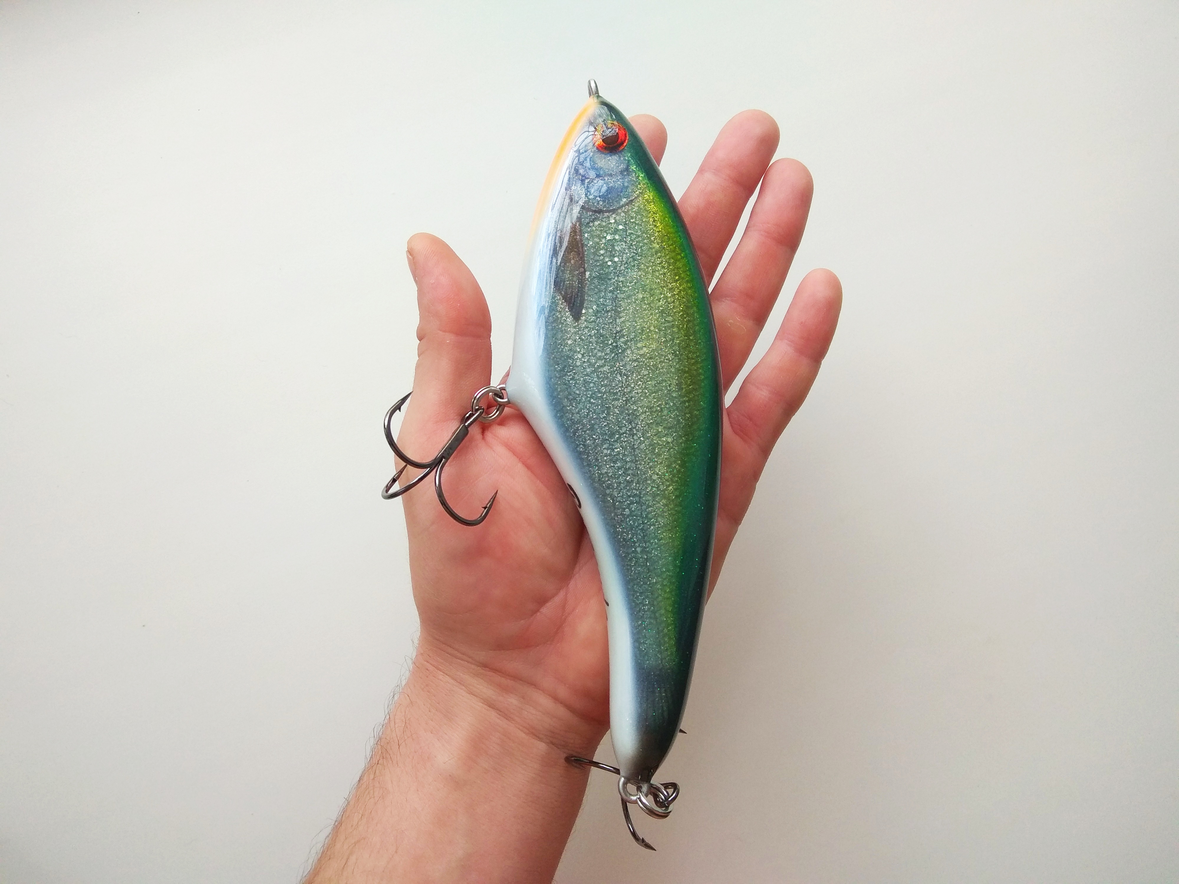 Решил делать в размере 16 см , медленно тонущий , гремящий.Жаберные крышки сделал объемными как на оригинальном джерке. Оговорюсь , джерк вышел не совсем короткоходным и вертлявым , а с глайдами средней длины. Вес джерка с тройниками Owner 2/0 - 125 гр.