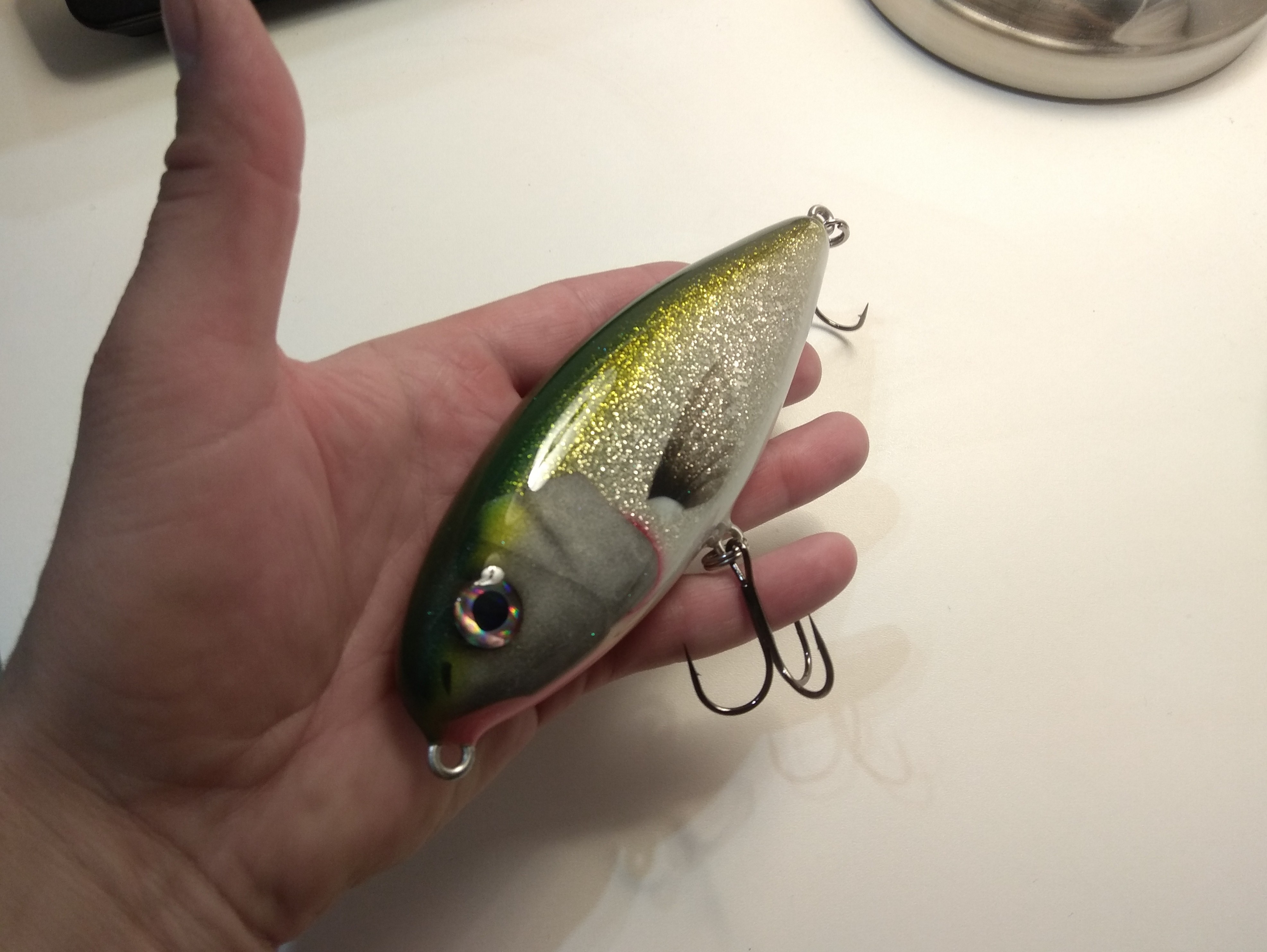 Решил делать в размере 16 см , медленно тонущий , гремящий.Жаберные крышки сделал объемными как на оригинальном джерке. Оговорюсь , джерк вышел не совсем короткоходным и вертлявым , а с глайдами средней длины. Вес джерка с тройниками Owner 2/0 - 125 гр.