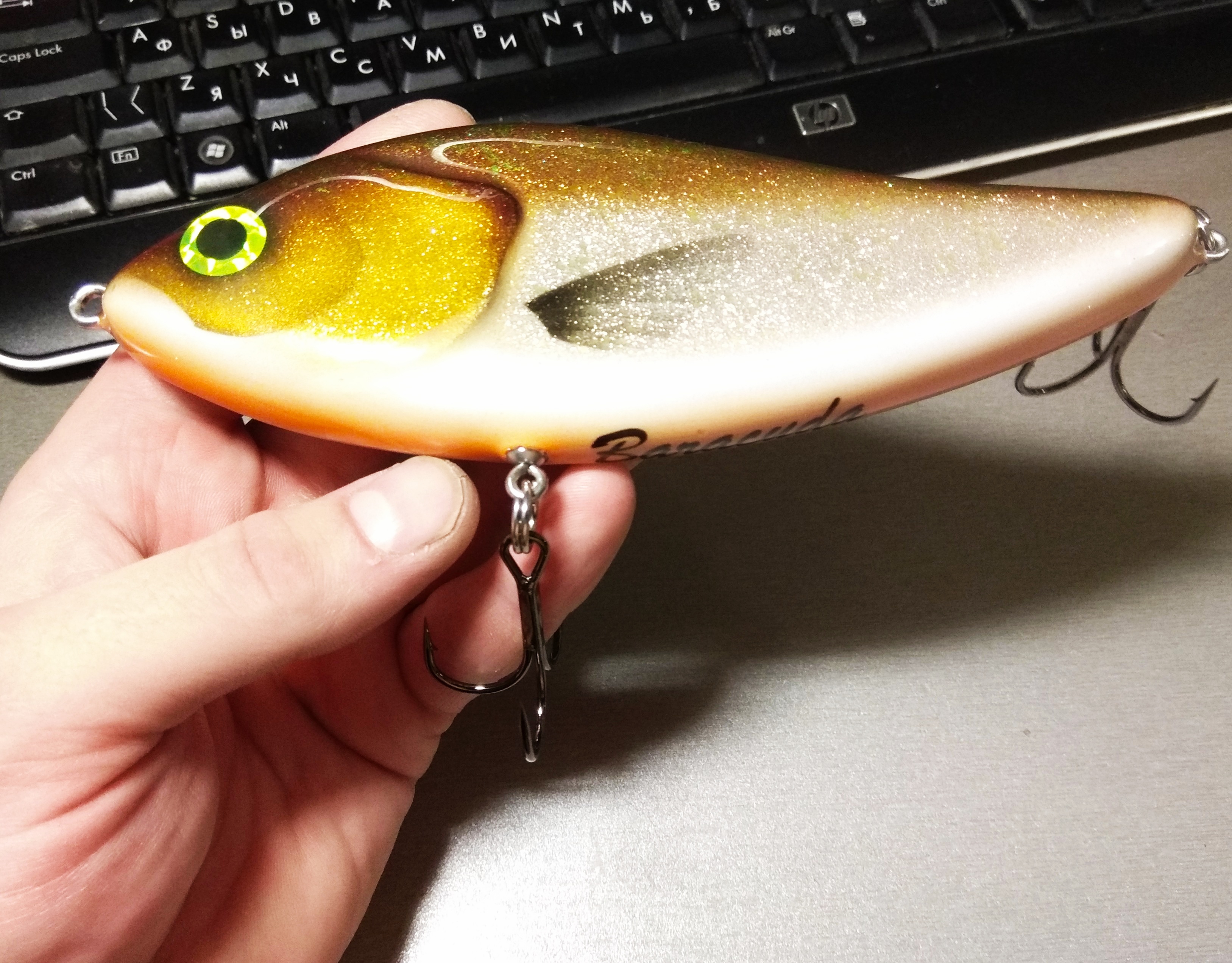 Решил делать в размере 16 см , медленно тонущий , гремящий.Жаберные крышки сделал объемными как на оригинальном джерке. Оговорюсь , джерк вышел не совсем короткоходным и вертлявым , а с глайдами средней длины. Вес джерка с тройниками Owner 2/0 - 125 гр.