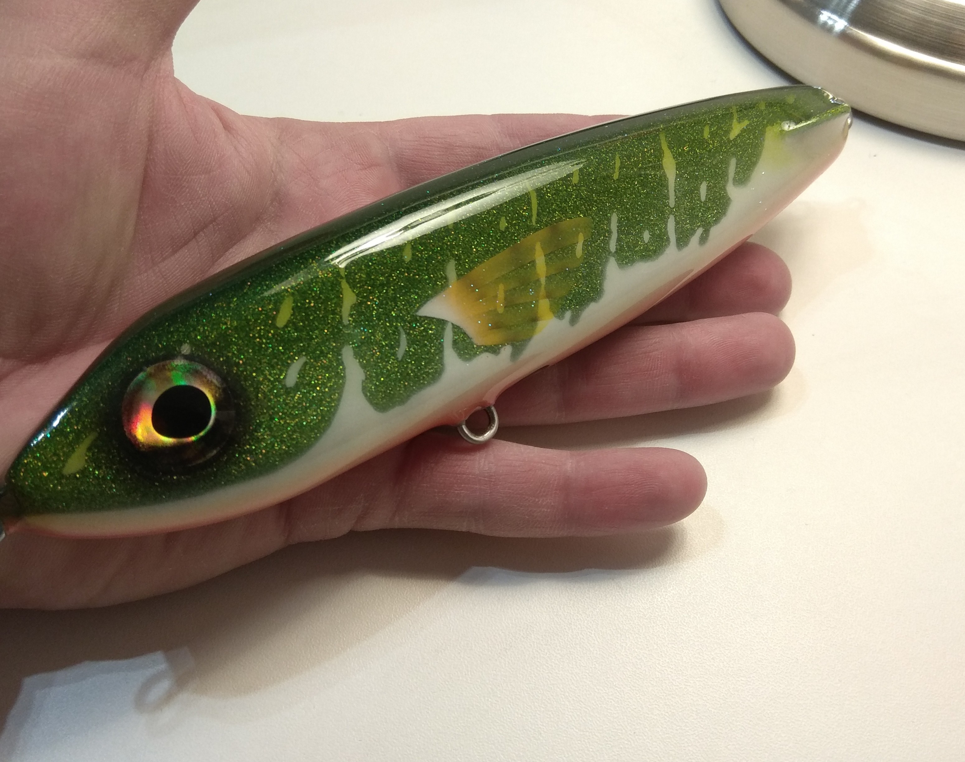 Решил делать в размере 16 см , медленно тонущий , гремящий.Жаберные крышки сделал объемными как на оригинальном джерке. Оговорюсь , джерк вышел не совсем короткоходным и вертлявым , а с глайдами средней длины. Вес джерка с тройниками Owner 2/0 - 125 гр.