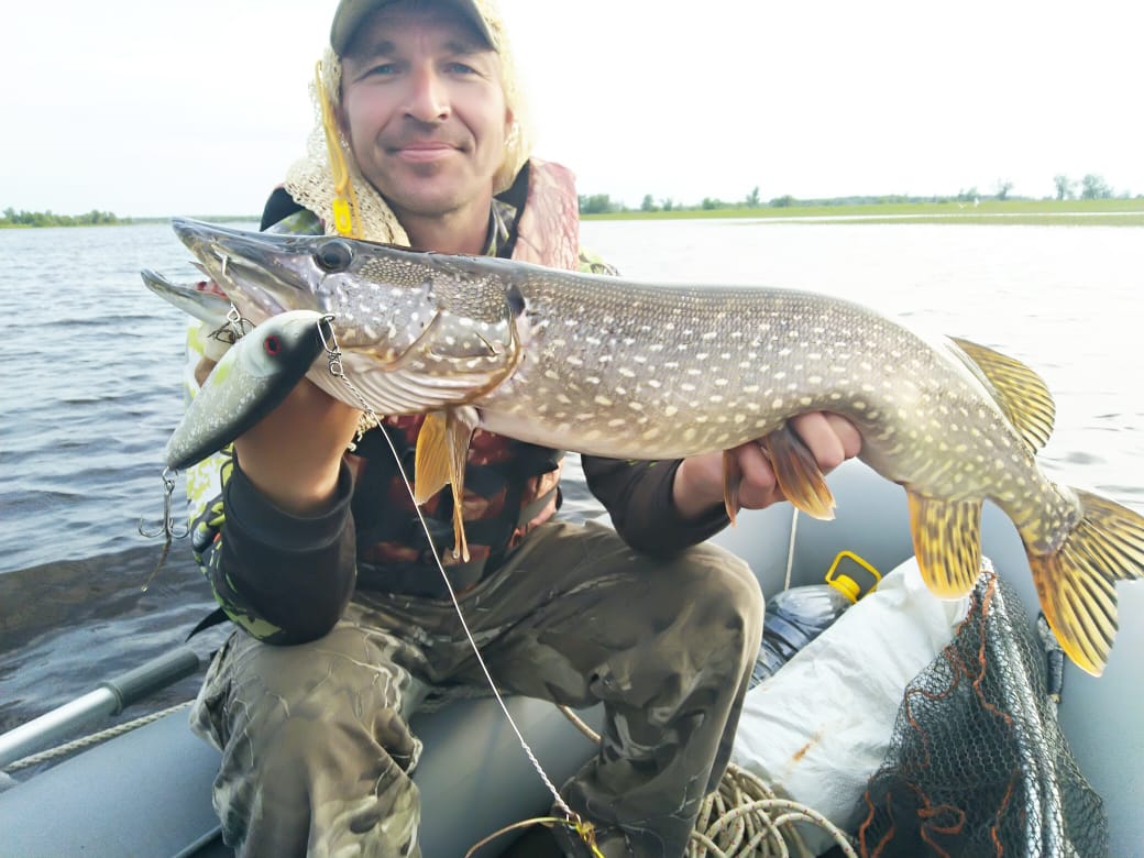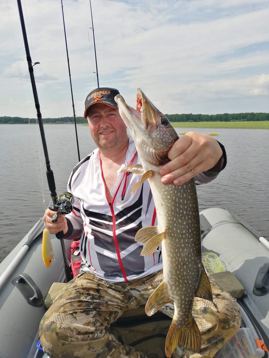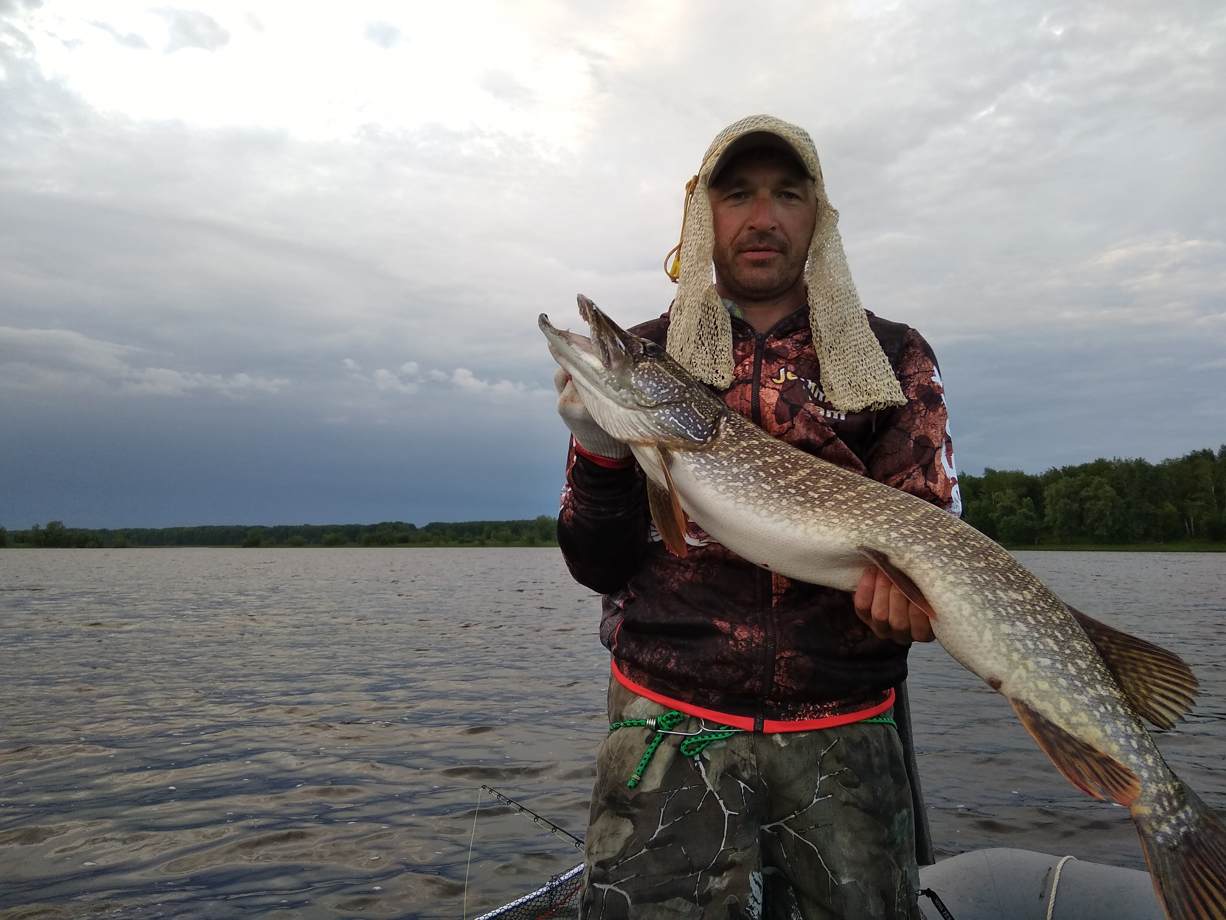 Утро следующего дня возвращает нас в реальность-где она,щука.Опять поиски и перебор приманок.После обеда начинает меняться погода,становится прохладней(первые три дня было за 30 гр.),надвигается фронт.К вечеру подул сильнейший ветер,гроза.дождь.Мы успели скрыться в лагере.Начало смеркаться,дождь успокаивается,гроза заканчивается,а у меня мысли,что надо на воду.Напарник соглашается и мы уже на воде. Встаем на против лагеря и погнали.Чутьё меня не подвело-щука начала отзываться.Внутренний голос подсказывает поставить хвостатого Палыча в цвете Мухамор.Один ударчик,второй и вот она,за кем я приехал сюда за тысячу вёрст.Весы показали 5700. Неплохо.