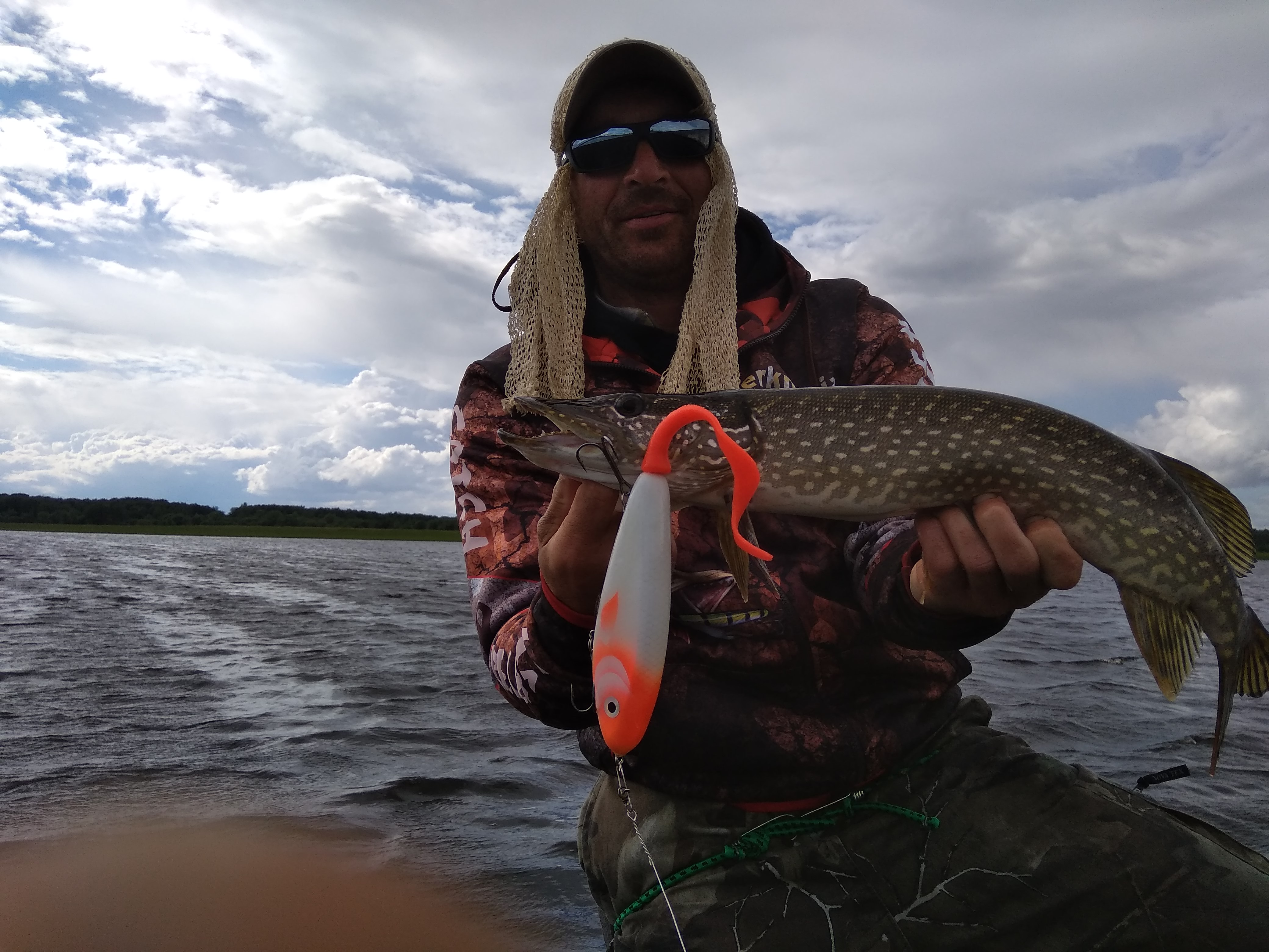На следующий день,как и во все предыдущие,ни чего особенного не происходит.Пытаемся поймать ветер,а его нет,так лёгкий ветерок. За пол-дня поймали по паре шнурков.Но начало хмуриться небо и сгущаться тучки.Решаем в этот раз в лагере не прятаться,а продолжать рыбалку.Заходим в залив с подветренной стороны,ветерок уже не слабый,что даже якорь не справляется.Начинаю облов резиной,пара прикусов,хотя до этого уже часа три поклёвок не видел.В голове опять щелчок,ставлю хвостатого плавающего Палыча и на первом же забросе удар.