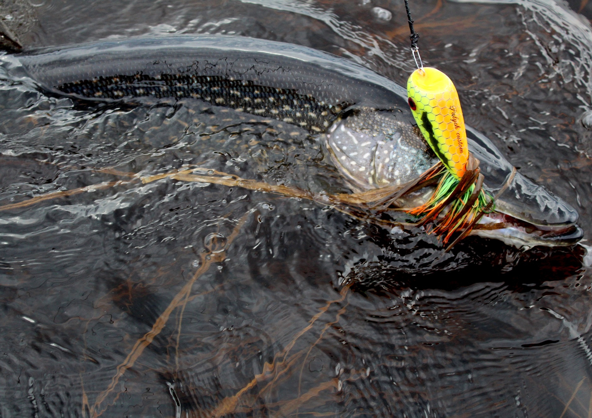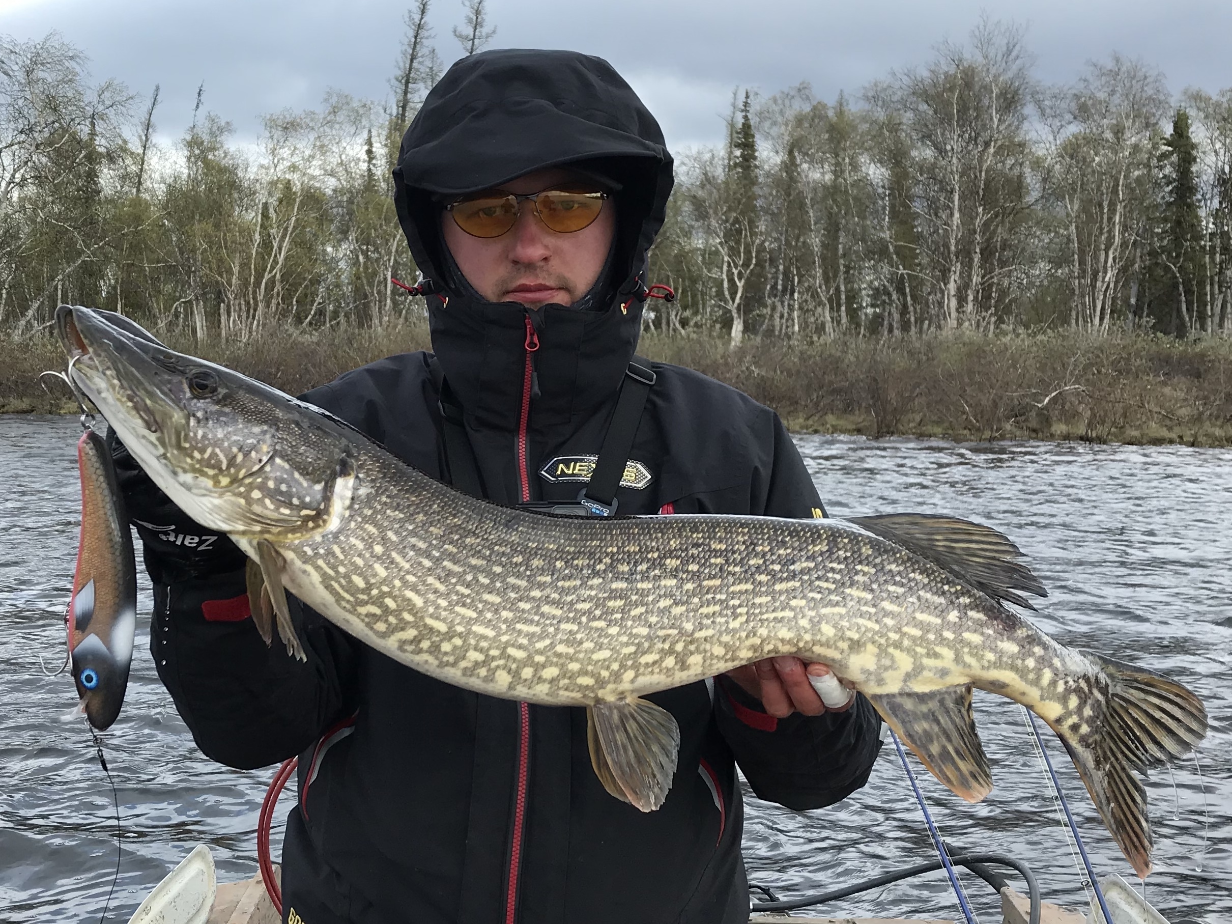 Утро следующего дня возвращает нас в реальность-где она,щука.Опять поиски и перебор приманок.После обеда начинает меняться погода,становится прохладней(первые три дня было за 30 гр.),надвигается фронт.К вечеру подул сильнейший ветер,гроза.дождь.Мы успели скрыться в лагере.Начало смеркаться,дождь успокаивается,гроза заканчивается,а у меня мысли,что надо на воду.Напарник соглашается и мы уже на воде. Встаем на против лагеря и погнали.Чутьё меня не подвело-щука начала отзываться.Внутренний голос подсказывает поставить хвостатого Палыча в цвете Мухамор.Один ударчик,второй и вот она,за кем я приехал сюда за тысячу вёрст.Весы показали 5700. Неплохо.