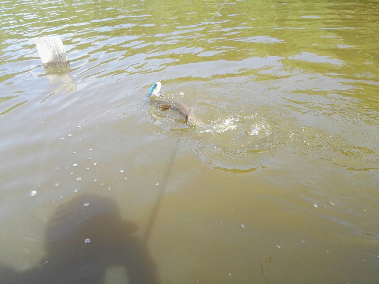 Так вот, насчет печали и поучения: берег крутой и высокий, метра полтора, я не думал, что поймаю рыбу больше 1-1,5 кг, а значит смогу ее поднять "краном". Хоть подсак и разложил, да кинул его очень далеко от себя. Ошибка "набр ту": фрикцион затянул туго, думал не пригодится. И ещё одна ошибка: не привил пока привычку после ловли на воблеры сечь рыбу. Итог трех ошибок - Она сошла, как только дал слабину, пока топтался по берегу, чтобы дотянуться до подсака. Я думаю, что около 5-ти, судья, что рядом стоял, оценил 6-7.