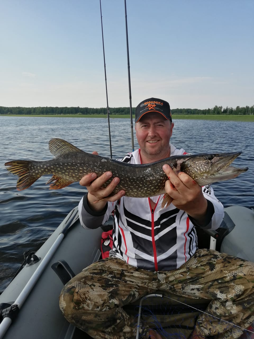 Утро следующего дня возвращает нас в реальность-где она,щука.Опять поиски и перебор приманок.После обеда начинает меняться погода,становится прохладней(первые три дня было за 30 гр.),надвигается фронт.К вечеру подул сильнейший ветер,гроза.дождь.Мы успели скрыться в лагере.Начало смеркаться,дождь успокаивается,гроза заканчивается,а у меня мысли,что надо на воду.Напарник соглашается и мы уже на воде. Встаем на против лагеря и погнали.Чутьё меня не подвело-щука начала отзываться.Внутренний голос подсказывает поставить хвостатого Палыча в цвете Мухамор.Один ударчик,второй и вот она,за кем я приехал сюда за тысячу вёрст.Весы показали 5700. Неплохо.
