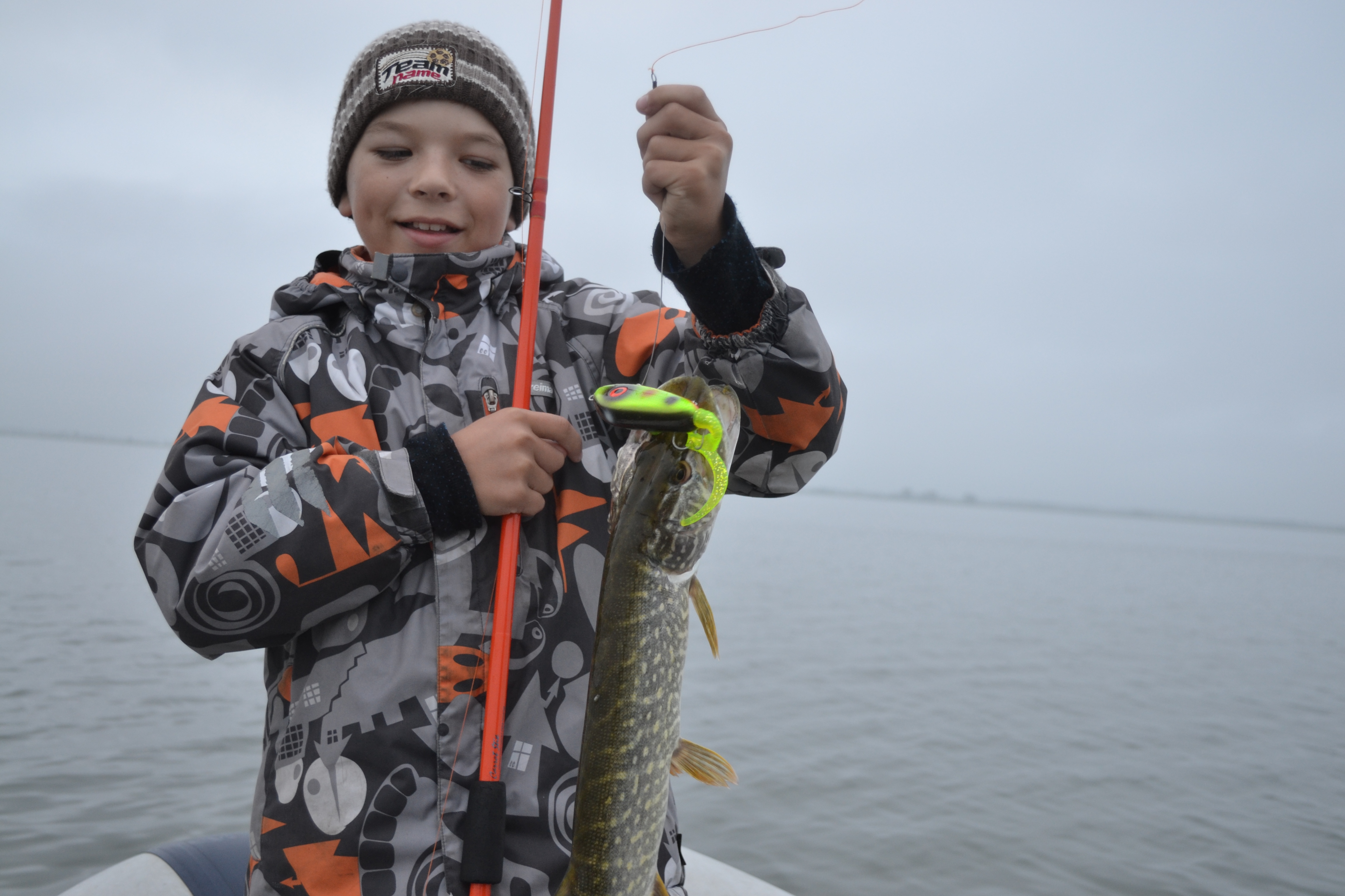 Предыстория: после того как я поймал на джерк свою первую щуку я сделал некоторые выводы:"Мне надо другой спиннинг подлиннее и полегче тестом так как этот ,я считаю,короткий и мне не удается закидывать джерк далеко и проводка какая-то не та которую надо" -сказал я папе. На что он мне ответил-"Хорошо, тогда я нахожу тебе другой спиннинг, но ты в свою очередь начинаешь ловить на него рыбу, а не валятся целый день в лодке"."Хорошо, я согласен на твои условия"- сказал я. Спустя какое-то время я начинаю задумываться: "Мне же надо поймать щуку или папа найдет себе нового напарника". :lol: На следующий день мы едем на рыбалку и мои догадки оказались правильными,мне и в правду стало легче и дальше забрасываться ну и джерки стало проводить проще. Еще через одну неделю мы едем на очередную рыбалку и в тот день я ловлю эту самую трофейную щуку: