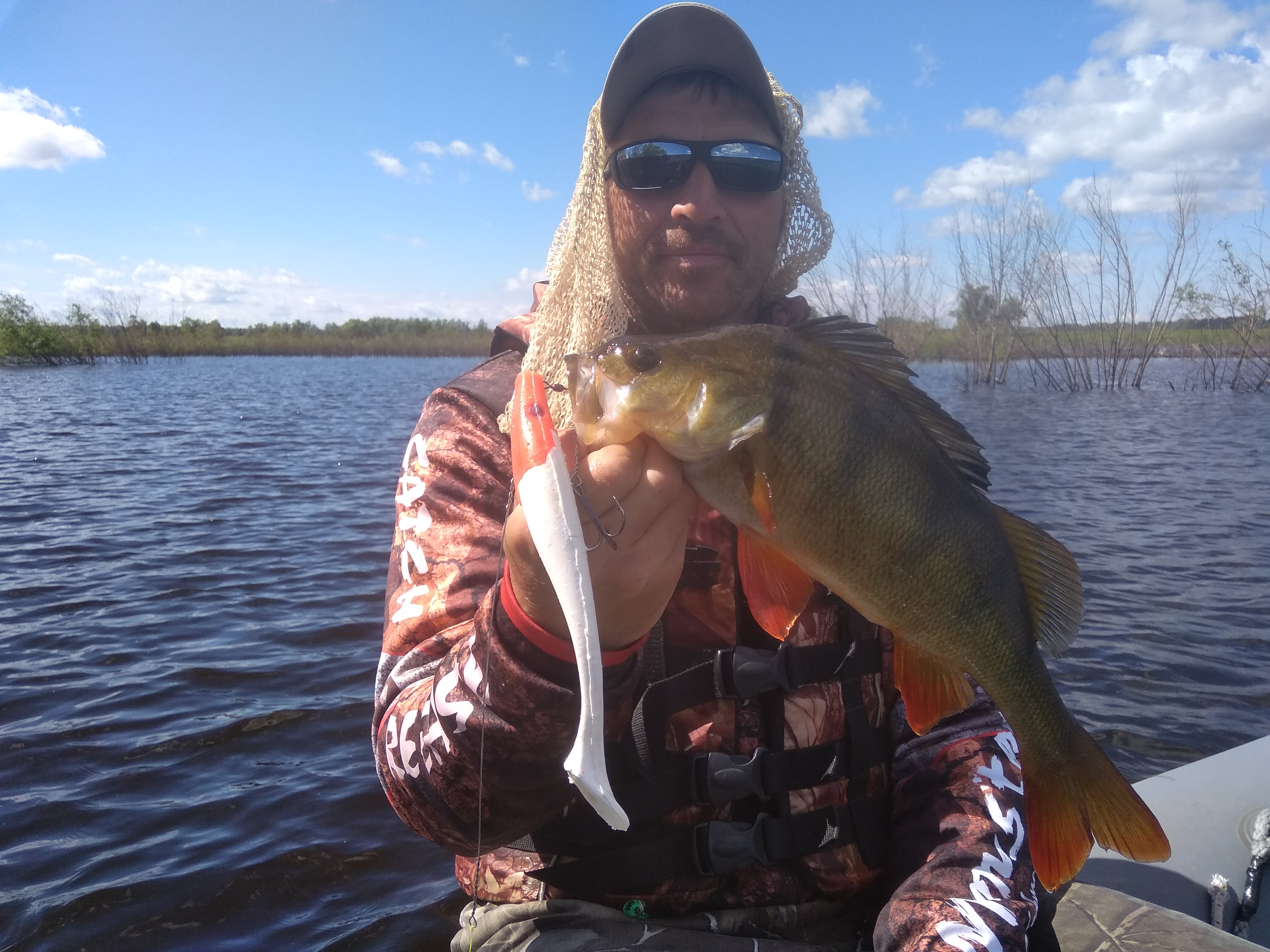 На следующий день,как и во все предыдущие,ни чего особенного не происходит.Пытаемся поймать ветер,а его нет,так лёгкий ветерок. За пол-дня поймали по паре шнурков.Но начало хмуриться небо и сгущаться тучки.Решаем в этот раз в лагере не прятаться,а продолжать рыбалку.Заходим в залив с подветренной стороны,ветерок уже не слабый,что даже якорь не справляется.Начинаю облов резиной,пара прикусов,хотя до этого уже часа три поклёвок не видел.В голове опять щелчок,ставлю хвостатого плавающего Палыча и на первом же забросе удар.