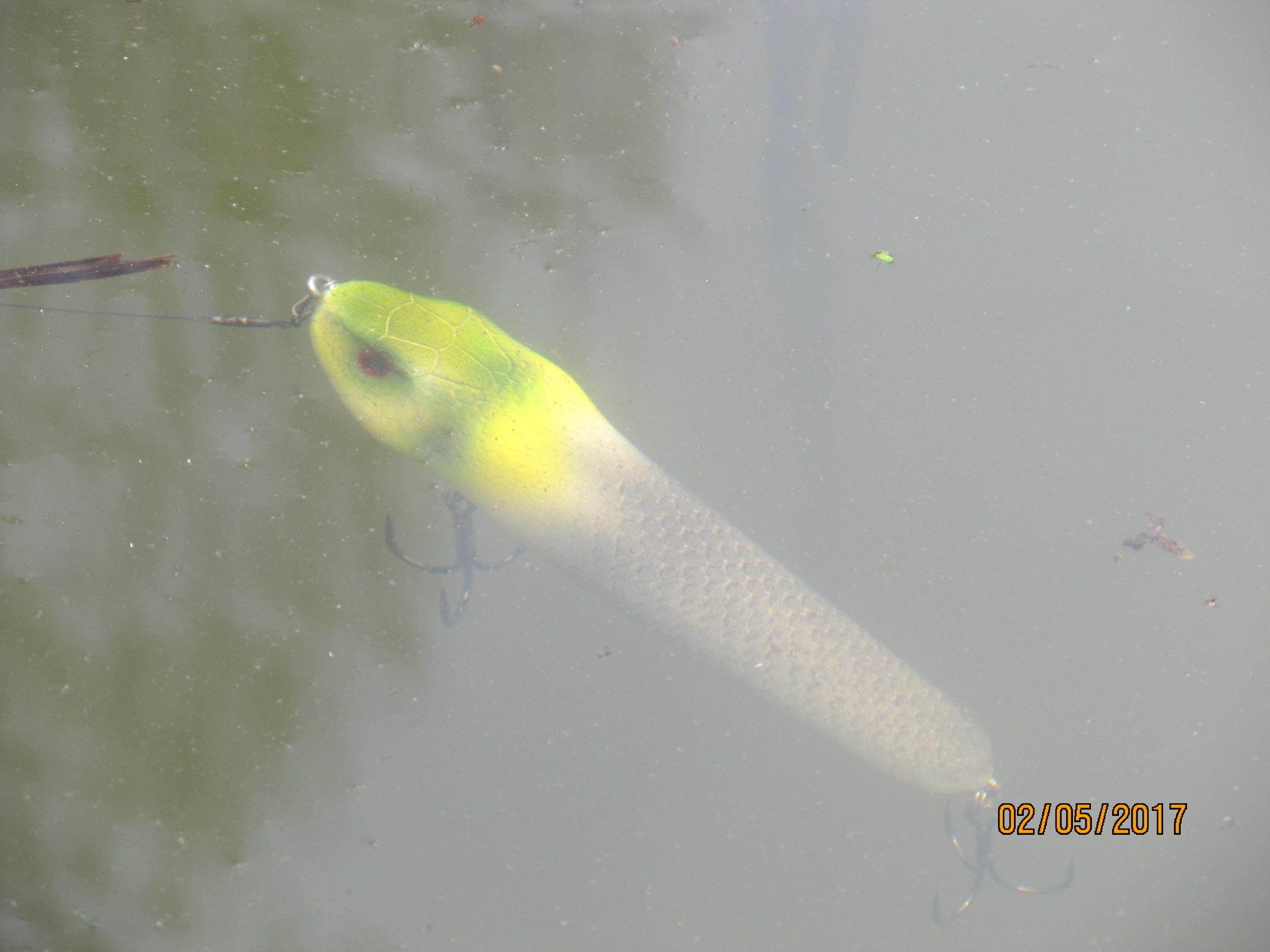 И так с поводком из титана 75LB 25см змея у борта стоит под поверхностью в сантиметре При выбросе голову держит над водой. Отчетливая змейка под поверхностью, с бульком и бурунчиками- отлично пролазит по этим глубинам, на падении практически не уходит под воду. Сначала я не сразу понял почему за "усами" от "Змея" есть еще какие то непонятные "усы" и почему непонятные бульки по хвосту... Оказалось это мелкие окуни с азартом пытаются покусать приманку