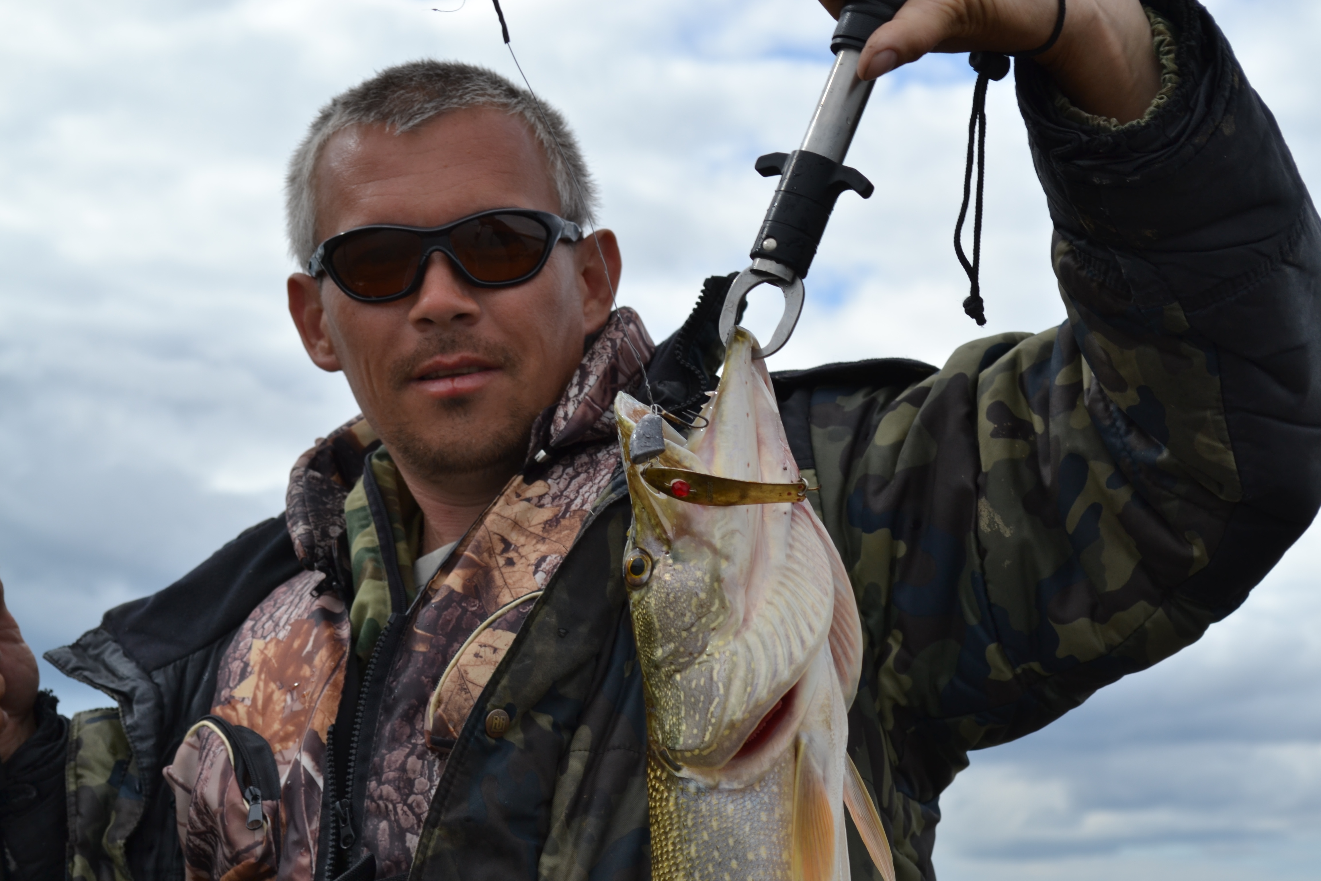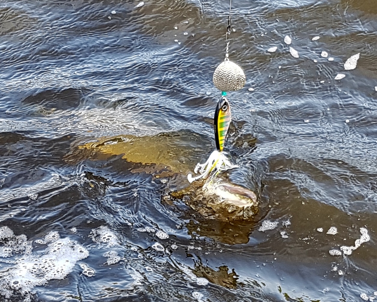 Калебло на севере незаменимая вещь-не ломается и не рвётся даже после сотни поклёвок.Так как на реке было сильное течение,напарник прицепил к калебалке джиг-головку и в принципе рыба это оценила.