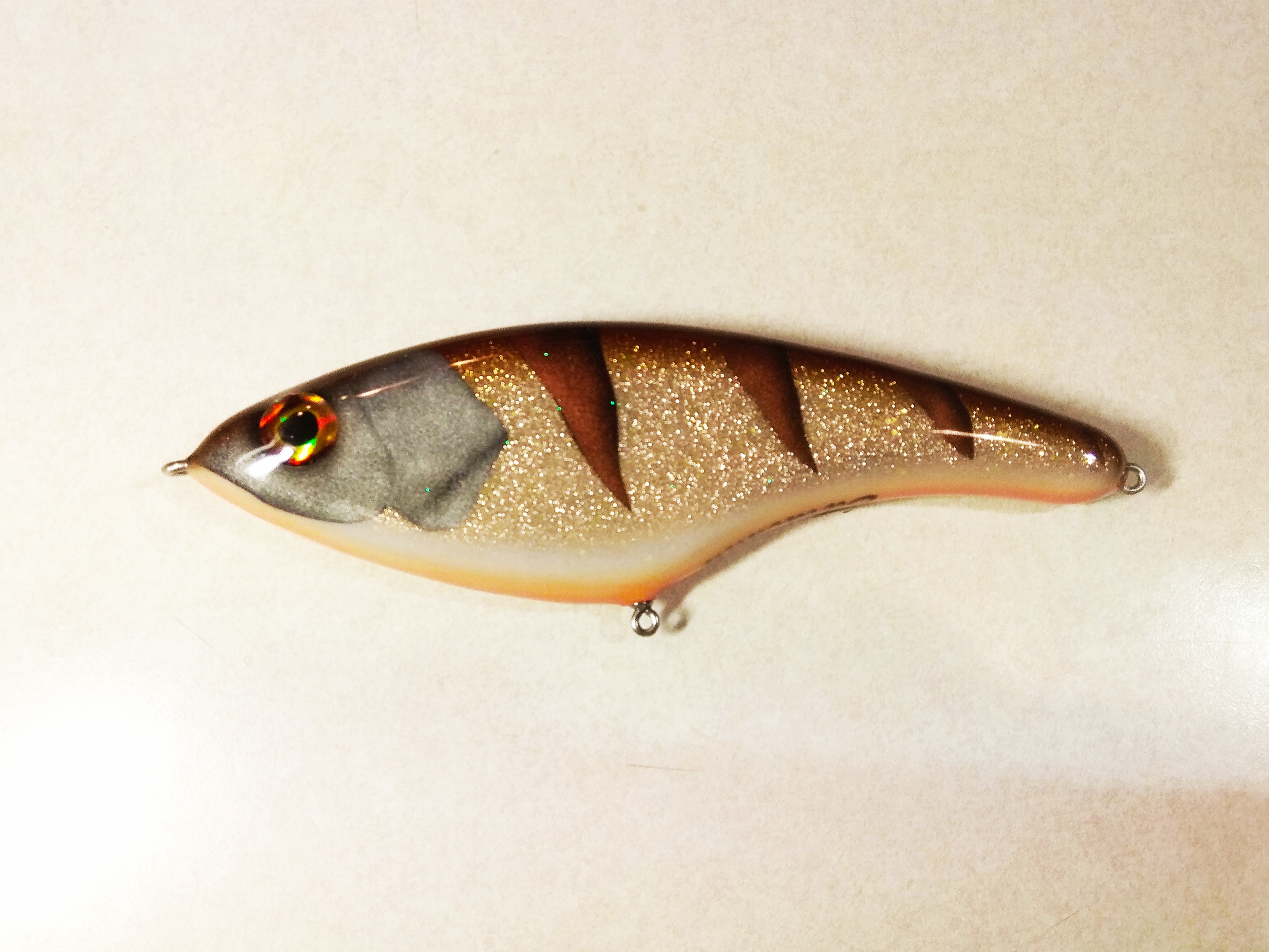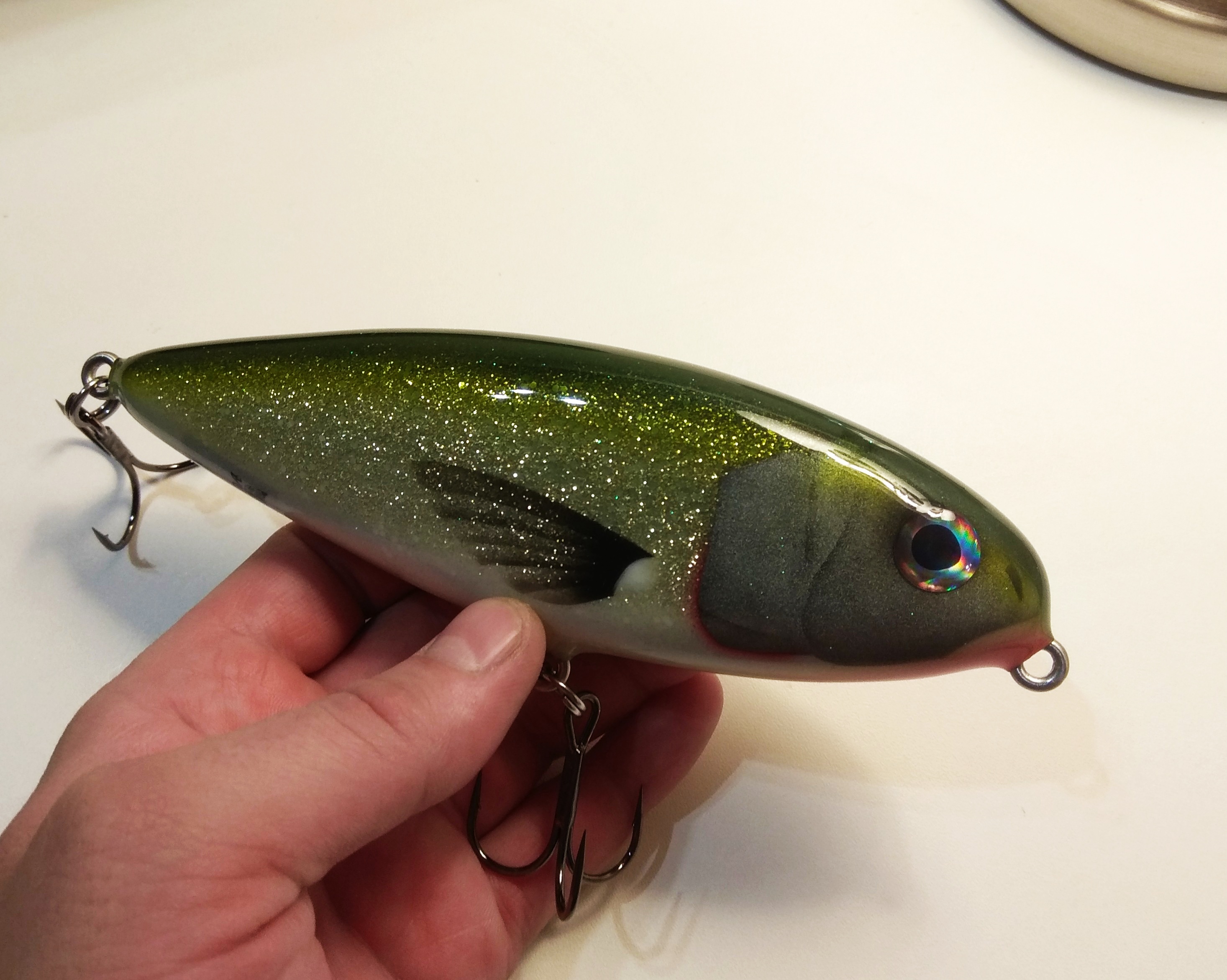 Решил делать в размере 16 см , медленно тонущий , гремящий.Жаберные крышки сделал объемными как на оригинальном джерке. Оговорюсь , джерк вышел не совсем короткоходным и вертлявым , а с глайдами средней длины. Вес джерка с тройниками Owner 2/0 - 125 гр.