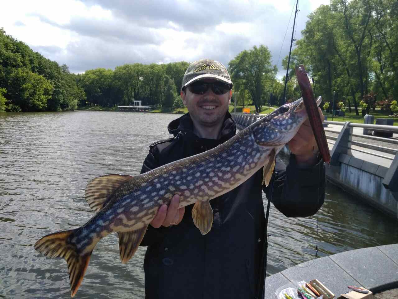 потом поднял прямо на плетёнке, и слышу народ подтягивается - "Смотри какая щука, ничего себе, на что это он её словил. Что за палка у нее во рту!" А щучка очень красивая, до 2 кило на вид. Попросил прохожих сфоткать и отпустил.