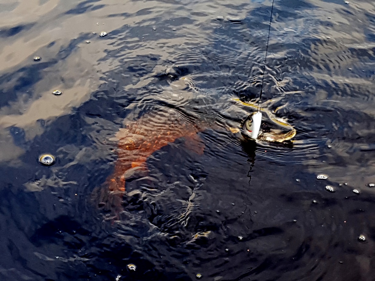 Разловил полностью серию дайверов Salamander. Не большие щучки ловились на Diver Salamander 180 Fins Tail и Diver Salamander Classic под затопленными береговыми кустами с глубинами от 1-1.5 м, что удивило их не остановила достаточно холодная вода +4С, джерки хапали жадно порой преследуя делая заходы для атаки. Проводка мягкими двумя/тремя потяжками с паузой на всплытие не давая до конца выйти приманке на поверхность. Хвостатый подгружал 10гр, заглублялся он на 30-40см, Классик без груза легко заходил 60-70см. Интересные возможности обнаружились у дайверов по применению, случайно метнул Salamander 180 Paddle Tail в старую траву и думал что усё, приехали, но аккуратно мотая шнур дайвер хлюпая хвостом благополучно вышел из травы и тут же последовал сильнейший удар приманка подлетела рыба не засеклась. Было еще пару мощных атак но так путного взять не удалось. В общем приманками остался доволен, то что хотелось у Алексея получилось, надо при ловле больше работать с огрузкой и настраивать приманку под определенные условия...