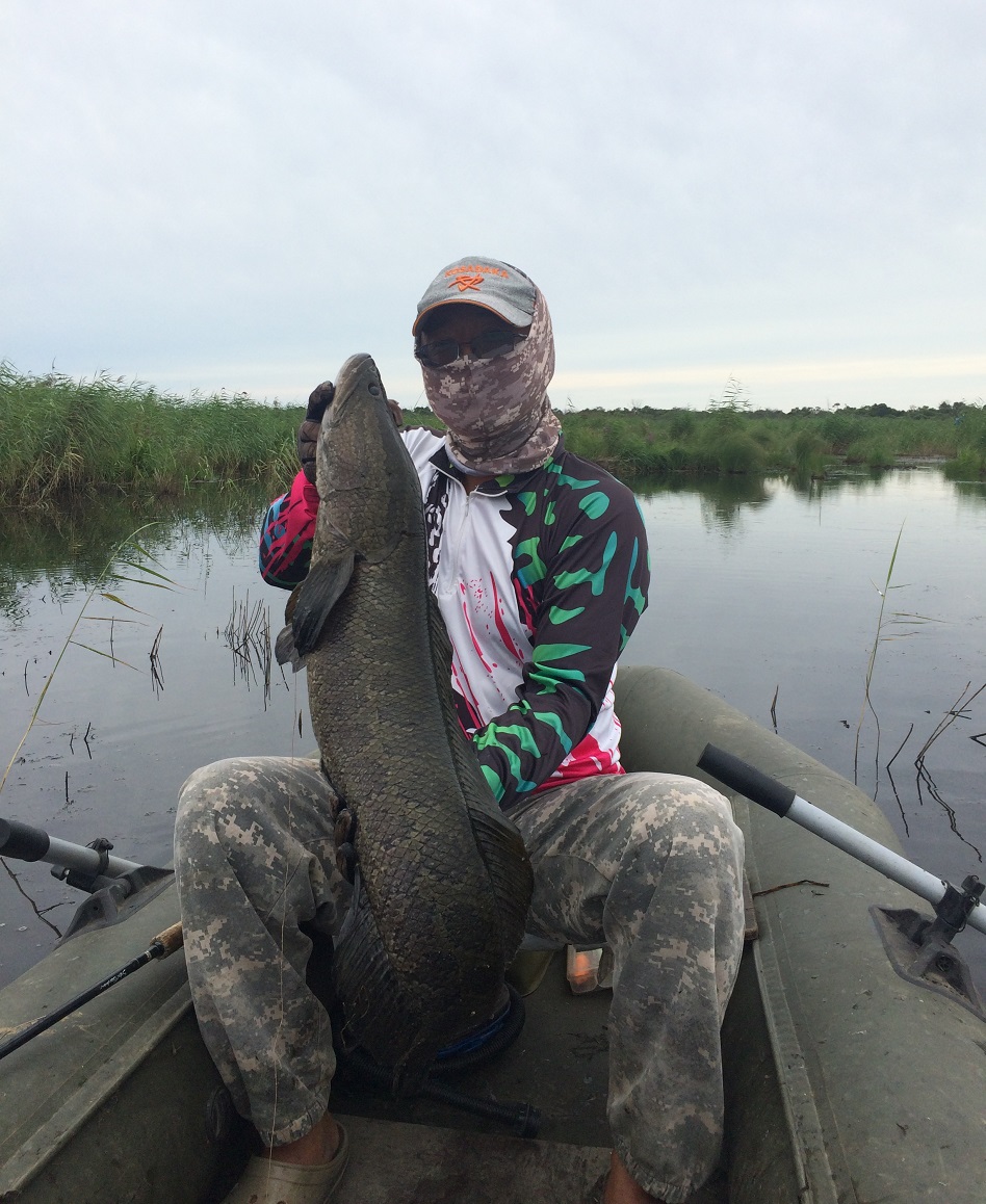Третья поездка в Уссурийский край. Ловим змееголова...вернее охотимся)) Поездка прошла и оглянуться не успел. Погода внесла свои коррективы из 6 дней чистой ловли было 4.5 дня да и то не отличающихся своей стабильностью, но тем не менее змей был, хоть и не без труда ловился, и это радовало. Задачу как и всегда ставлю сделать шажок вперед, набраться нового опыта и поймать трофей...С самого первого дня включил тактику выследил, тихо подошел и поймал...Не всегда это удавалось но все же меньше 2 кг у меня змея не было, ловились 3, 3.6, 4 и 5кг. Пусть и не много но крупно, задачи набить "тузиков" не было, адреналину хапнул, свой рекорд перешел, чем и доволен... В ловле использовал удилище Abu Garcia Svartzonker Signature 8,6" 40-140 с катушкой BFT Instinct X7, шнур Varivas Camo 100LB и кучу лягушек от известных японских и американских производителей... подробнее отчет осенью!