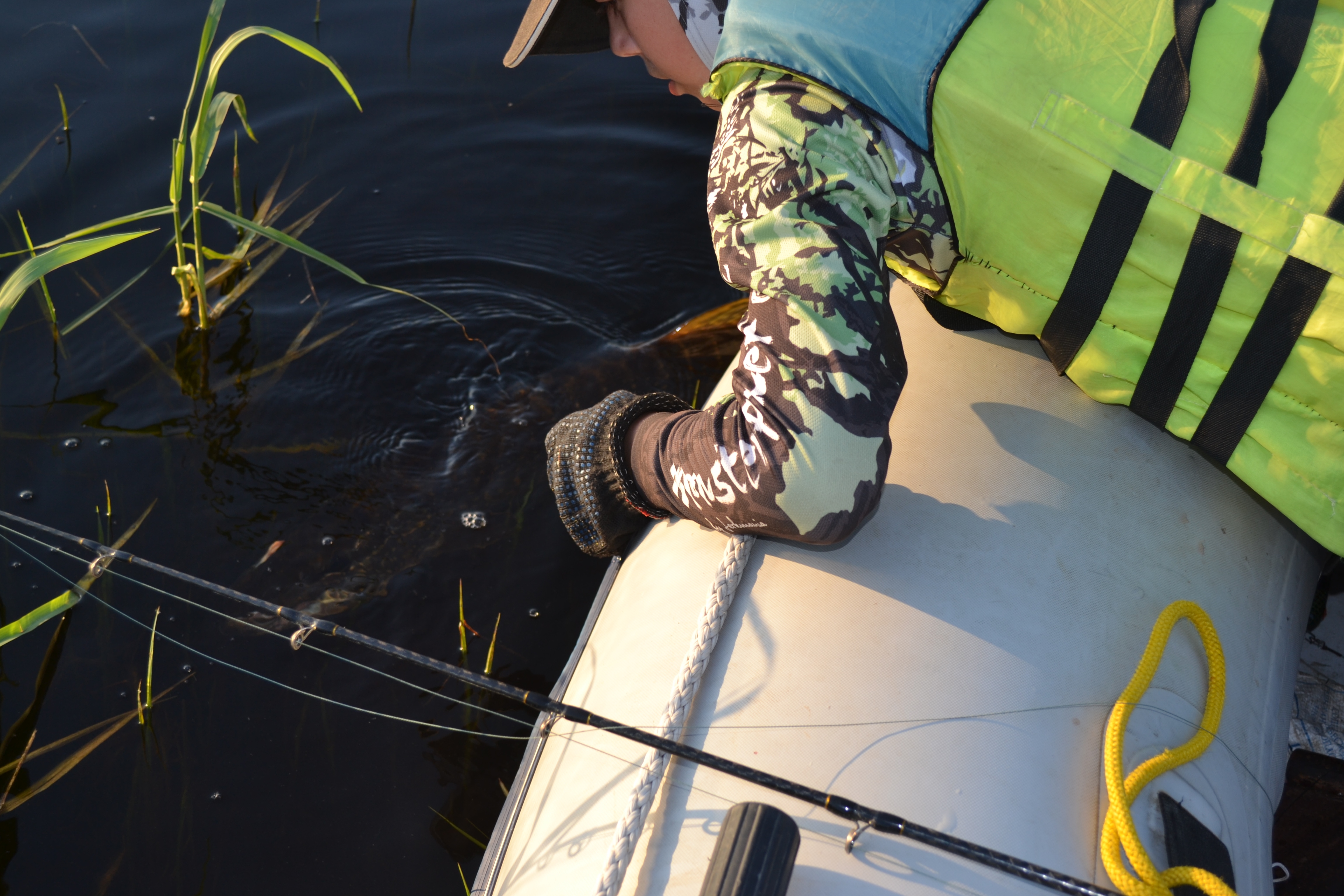 Найдя заход в старицу и место где наш лагерь будет располагаться, развернули палатки и положили туда вещи. После небольшой передышки от дороги мы вышли на воду немного порыбачить, и со второго заброса кастомного змея от папы (от Михалыча), после пяти минутной рыбалки я поймал то чего так долго ждал несколько лет,он, новый трофей: Счастья было полные штаны.