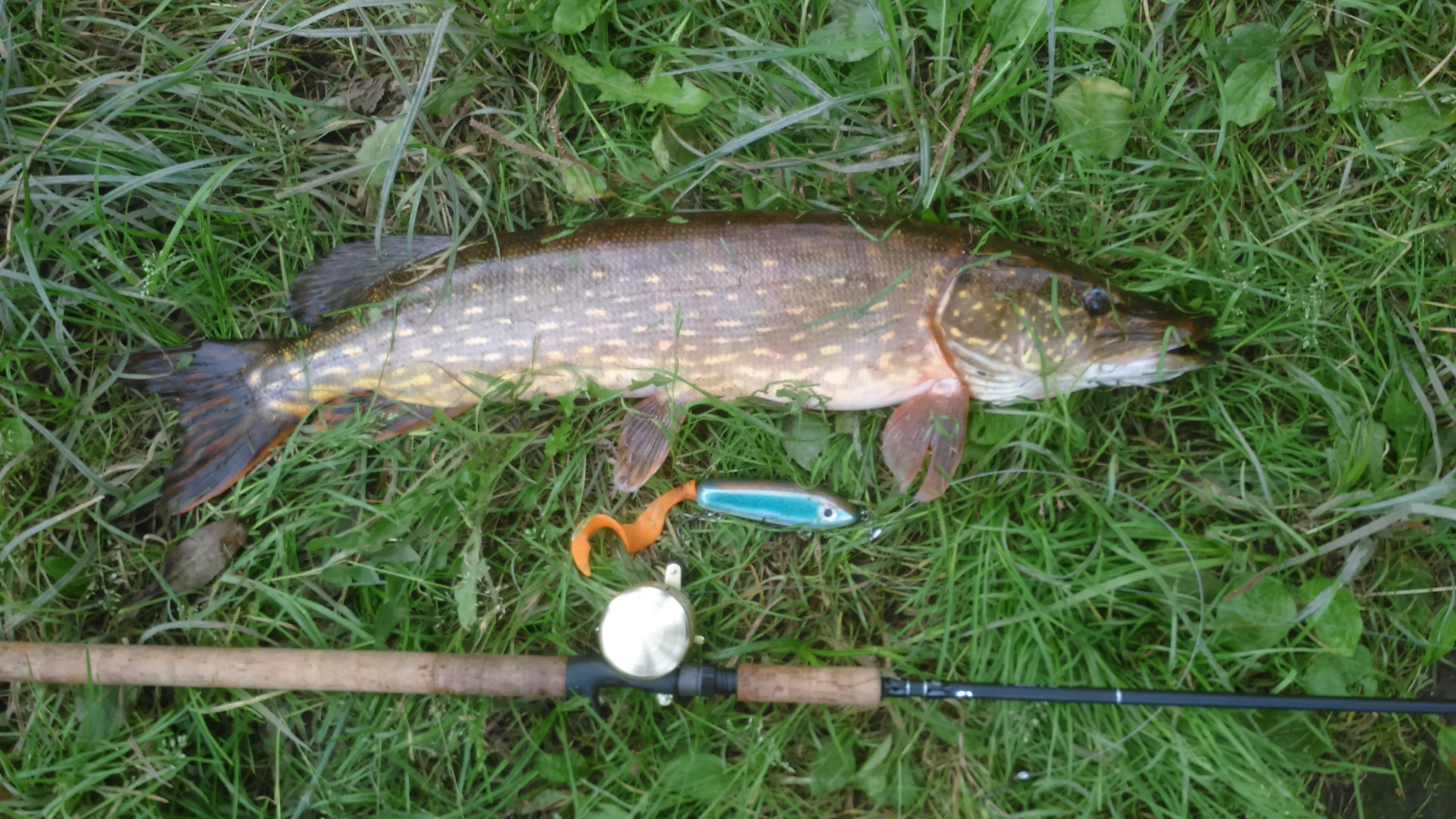 Всем Привет! Ехал с работы, проезжал речку Охта. Решил покидать не много приманки. Вышел на берег, смотрю на треноге из веток висит пакет полииэтиленовый, а вокруг никого. Захотелось посмотреть, что там? В нём плавали плотвичка пару окушков. Вообщем взял и выпустил их. Через пару минут нарисовался дедок и давай плакать : Да, что же ты на делал, всю рыбу мою выпустил, я её целый день ловил. Что то стало не посибе. Думаю, счас поймаю шнурка и отдам деду, чтобы нерастраивался. Начинаю ловить рыбу, ставлю Силко под Шварца с хвостом. Закидываю под кустик, вдруг Ба-бах, Есть!!! Фарсирую события быстро вываживаю на берег у деда глаза на лоб. Говорит: что здесь не ловили таких рыб. Щука потянула на 5кг 115гр. По фотогоафировал и стал думать, возник вопрос: Обещал же деду шнурка отдать, но всё таки решил её отпустить. Да и дед от увиденной рыбы забыл про обиду. Ну как то так.