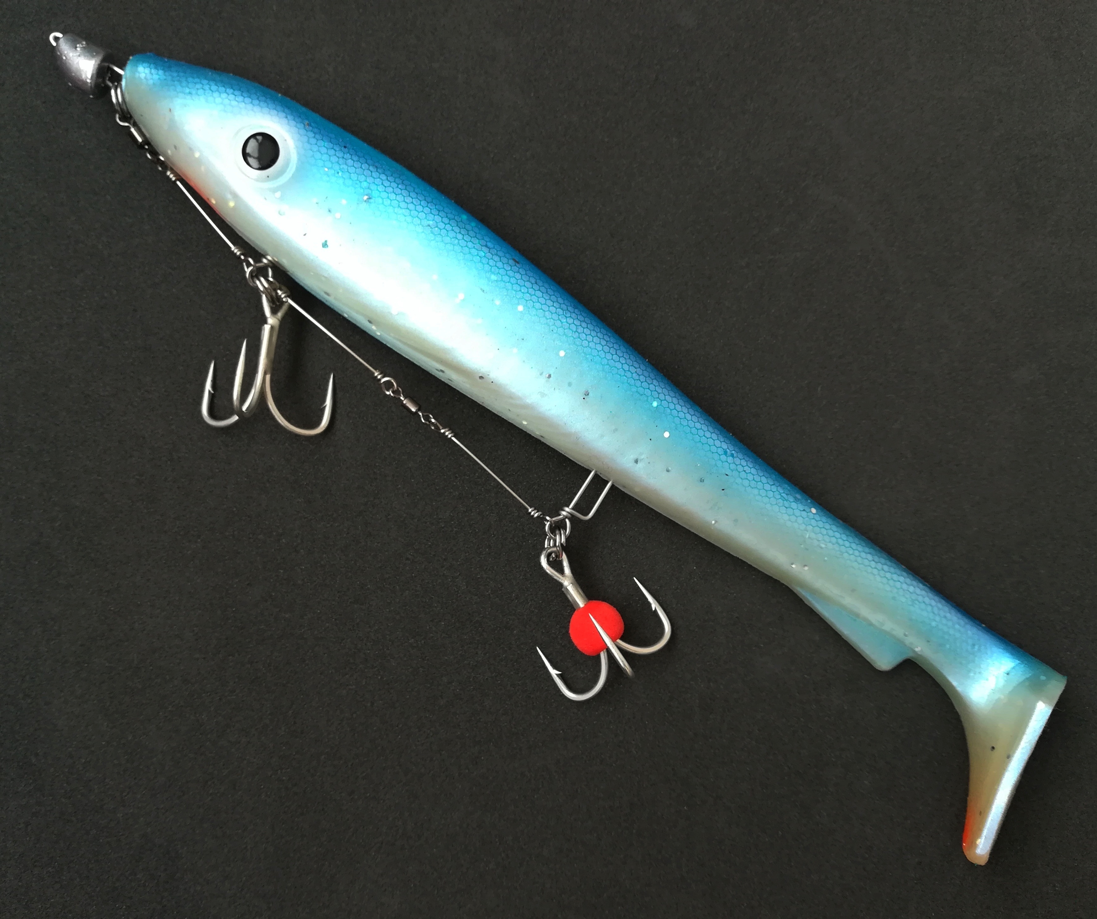 Ну и в конце экспериментальный вариант оснащения приманки двойниками, прижатыми к телу. Без использования магнитов. Подходит для узкотелых, относительно некрупных приманок. В данном случае фиксатор применяется более короткий (чтобы не мешать подсечке) и изготовлен он из более тонкой проволоки –0,8мм. Можно этот способ попробовать и на тройниках. Практика покажет.