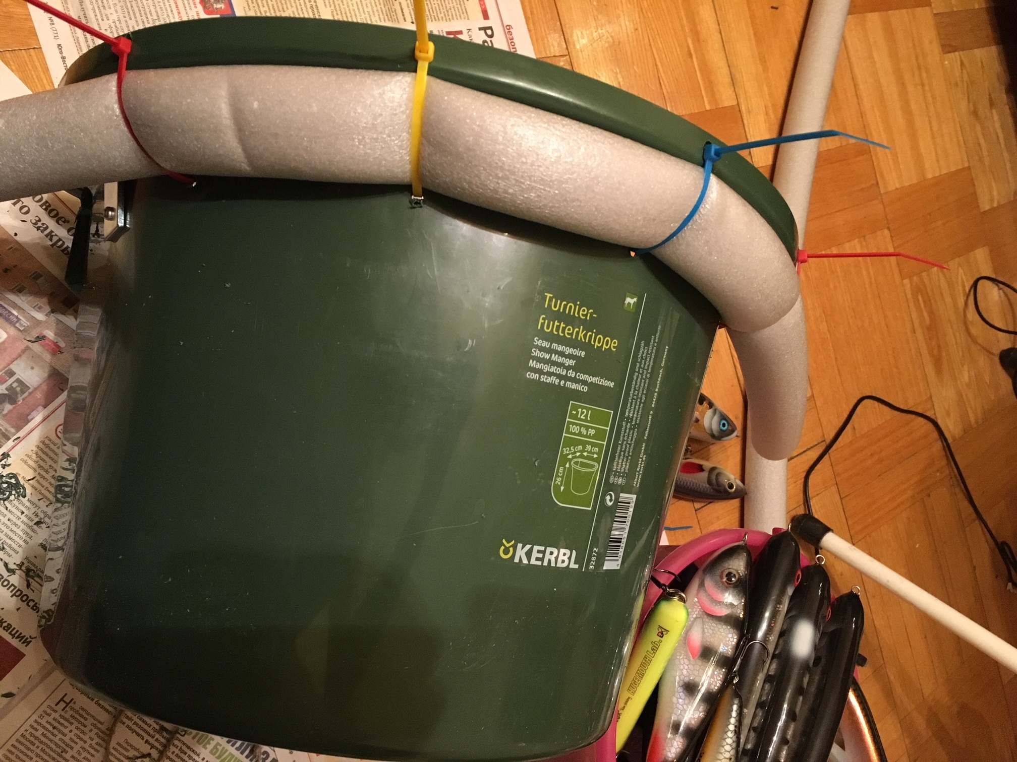 Часто задают вопрос как сделать ведро... Можно поискать в конных магазинах если повезет то там есть весьма не плохие. Можно подобрать что то в хозяйственных, там же купить короткую трубу 100мм с заглушкой. Я брал ее в Леруа Мерлене. Если нет дырок под крючки, то просверливаем их по кругу борта обода. Просверливаем несколько дырок на заглушке и примерив и в ведре. Это для крепления. Затем на трубе делаем произвольные насечки что б не сдвигались приманки. Собираем все части и крепим болтиками или заклепками. Что б не поколоть руки можно пришпандорить полиуретановую трубку...и все готово!