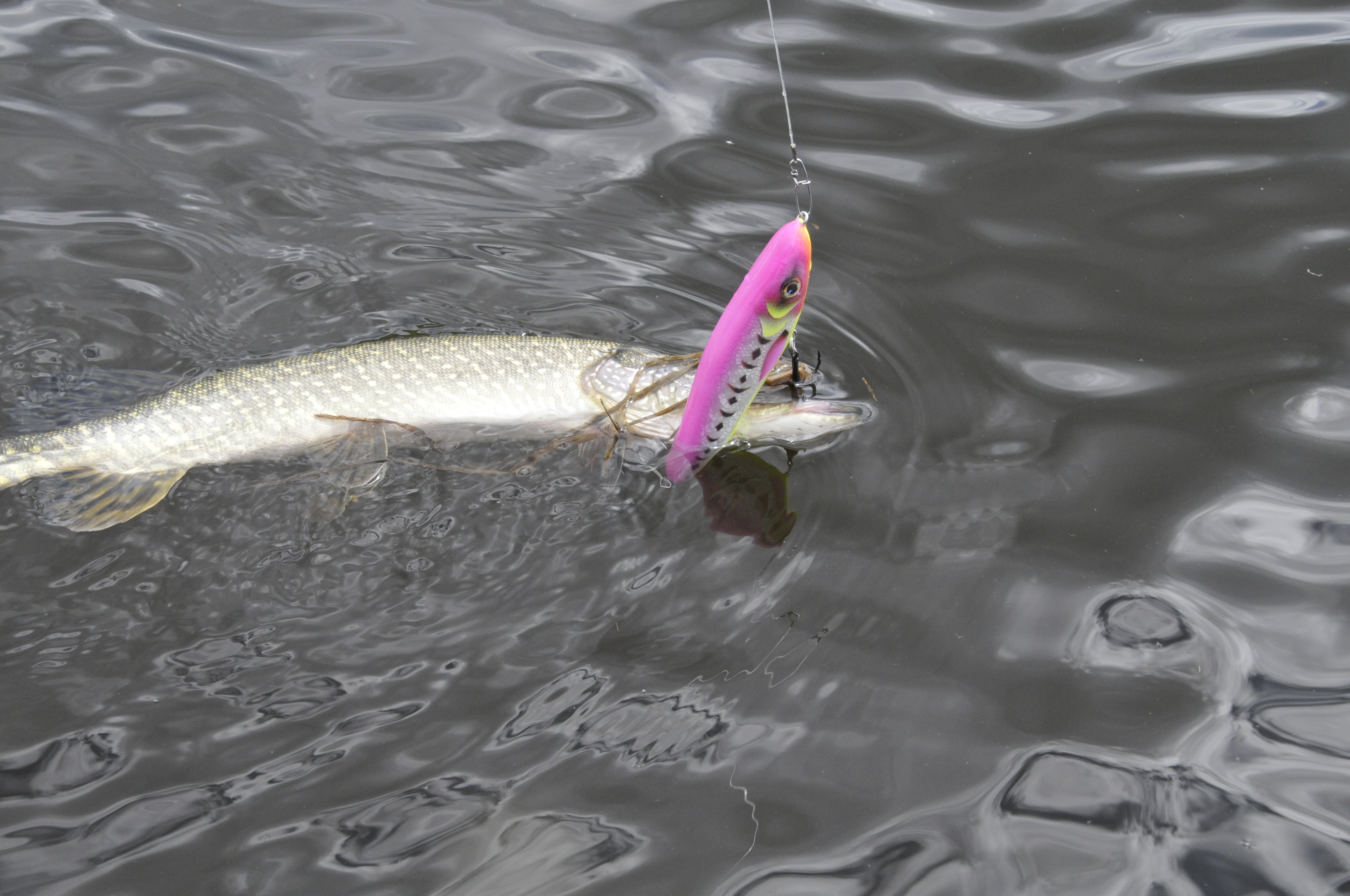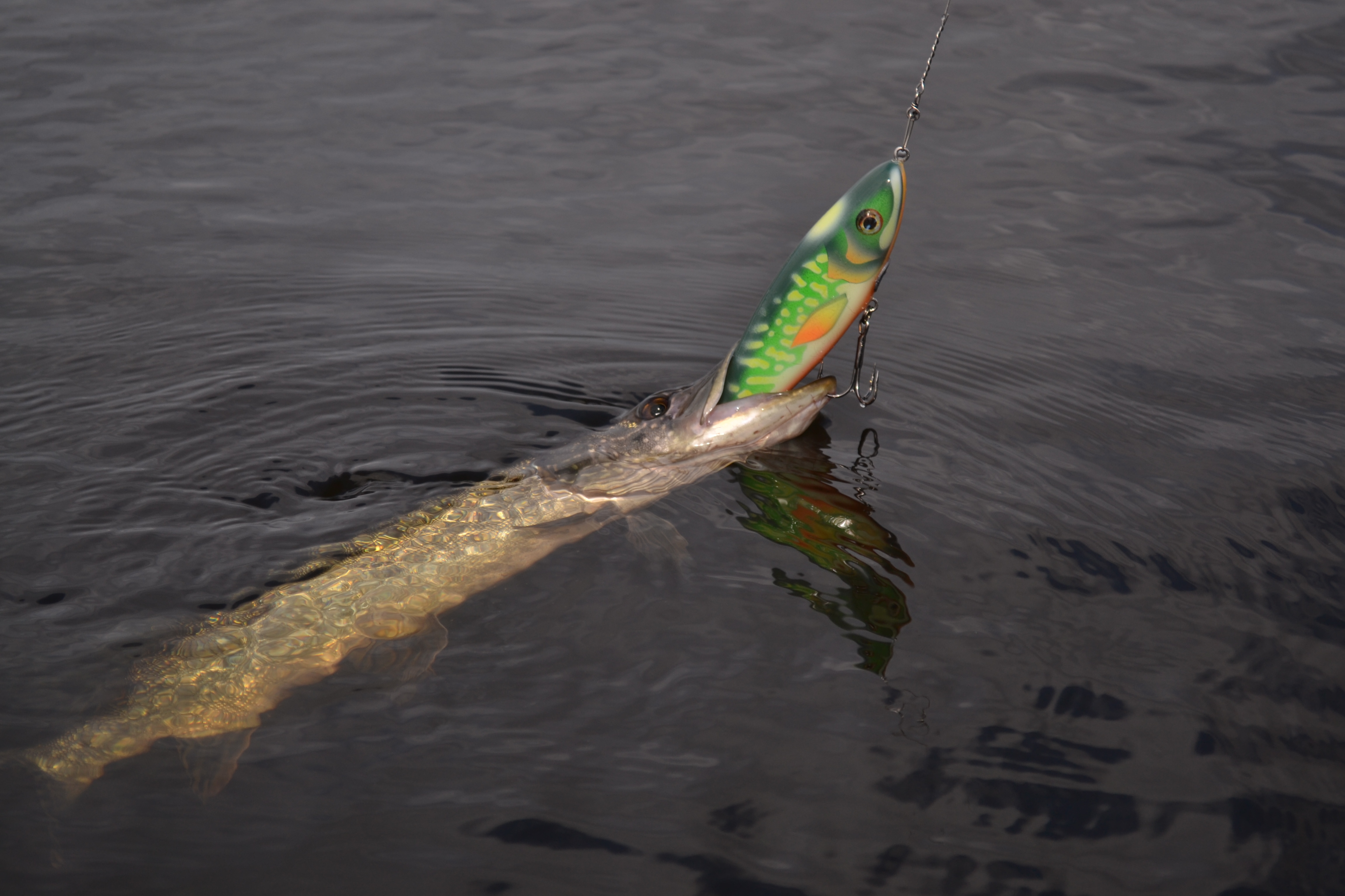Я был рад что папа поймал такую большую щуку и этим поставив свой новый джерковый рекорд, и этим я понял что у меня есть шанс поймать такую же , и в самом деле я ее почти поймал она выпрыгнула у самой лодки за джерком ,но у меня не получилось ее до ловить. Я не много из-за этого расстроился, но чего расстраиваться то, у меня же таких щук будет куча.