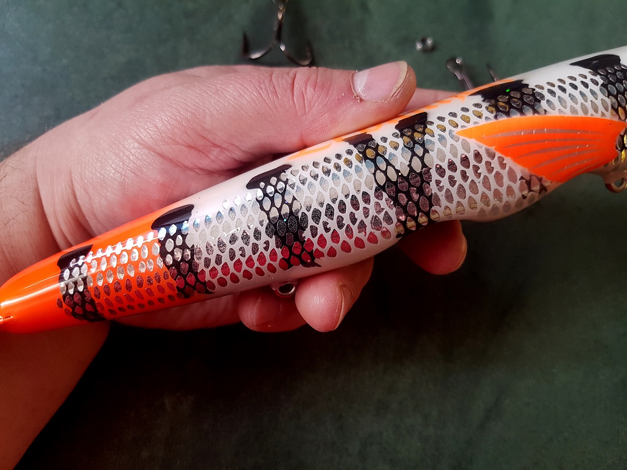 Наконец то занялся обновками, есть куча мыслей на сезон, лишь бы хватило времени всем половить :D За этим дайвером гонялся больше года, и наконец срослось... и вот у меня в руках LEVIATHAN 10 " современная реплика на американскую классику джеркбейтов Dive and Rise, от Lee Lures Custom Baits. Давно почитаю Ли Таучена как охотника за трофейными маскинонгами и продвинутого в этом деле мастером приманок. LEVIATHAN имеет весьма не простую в изготовлении форму, выдержать все обводы корпуса очень не простая задача. Очень сочная покраска с серебрянными чешуйками и 4 слоя с эпоксидным покрытия. На сколько я знаю из 10 заготовок свет увидят 3-5. Малейшая не точность и приманка запилена и идет в брак. Так что цена и время производства делают ее совсем не массовой. Дайвер сделан по схеме с двумя лузами куда вкручиваются огрузочные шайбы 2 oz,1.5 oz и 1 oz, их по две штуки и можно ставить в любых вариантах в зависимости от задач.