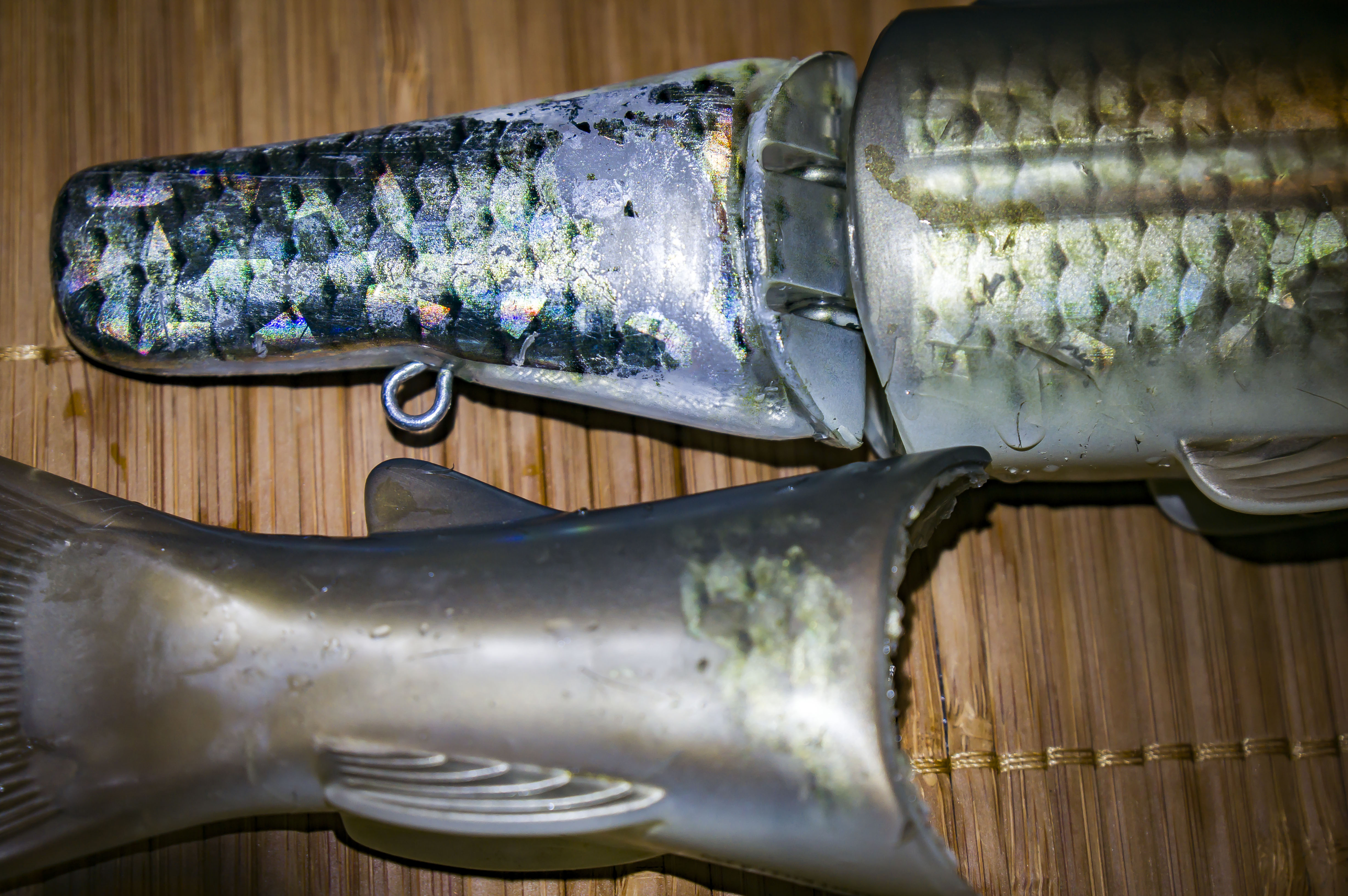 Наконец дошли руки. Более внимательный осмотр свимбейта вызвал новые и неутешительные мысли по поводу её дальнейшего использования.. Надежды на крепкое резиновое покрытие к моему сожалению не оправдались- очень много сквозных царапин! И это при поимке новой приманкой всего-то семи щук.