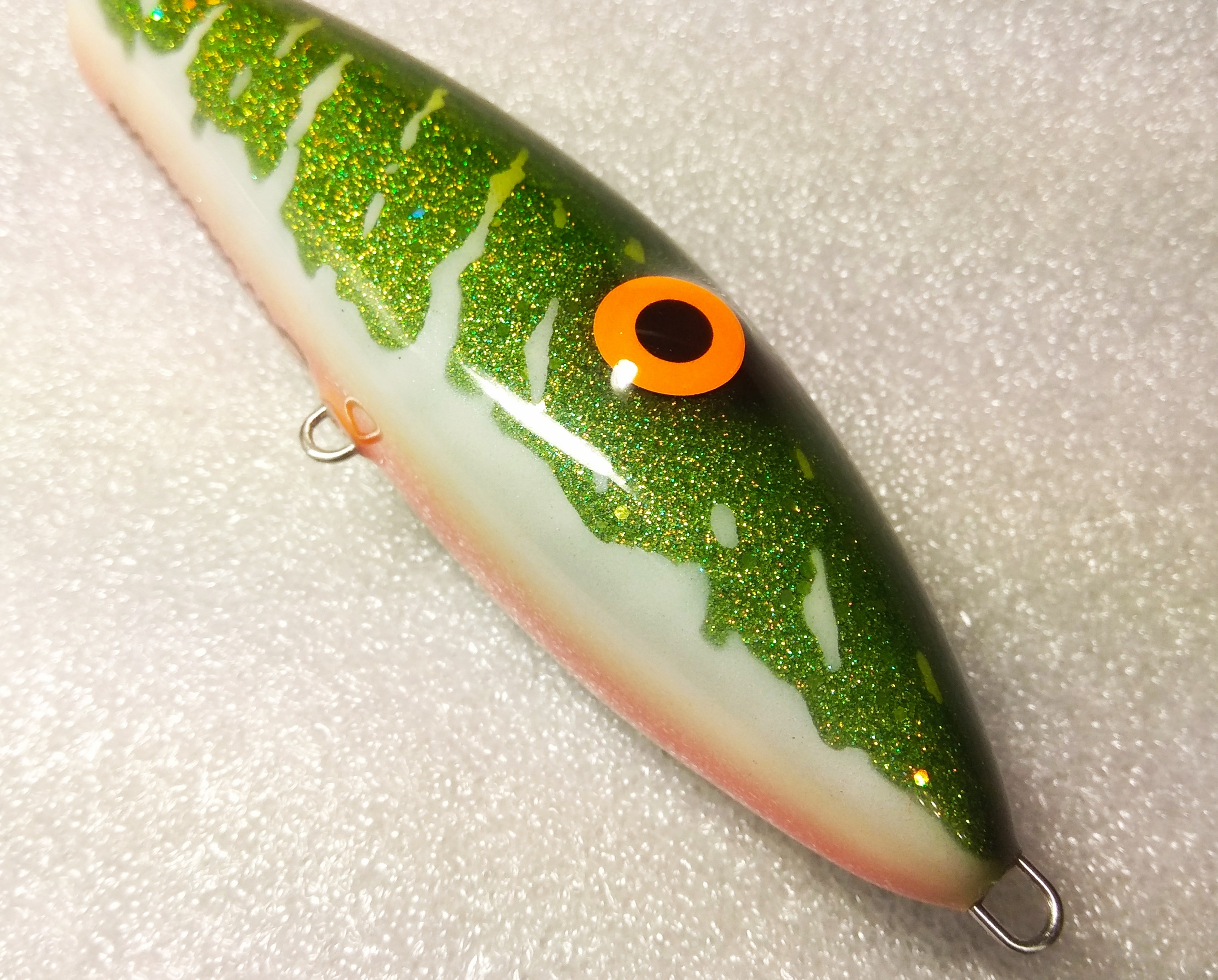 Решил делать в размере 16 см , медленно тонущий , гремящий.Жаберные крышки сделал объемными как на оригинальном джерке. Оговорюсь , джерк вышел не совсем короткоходным и вертлявым , а с глайдами средней длины. Вес джерка с тройниками Owner 2/0 - 125 гр.