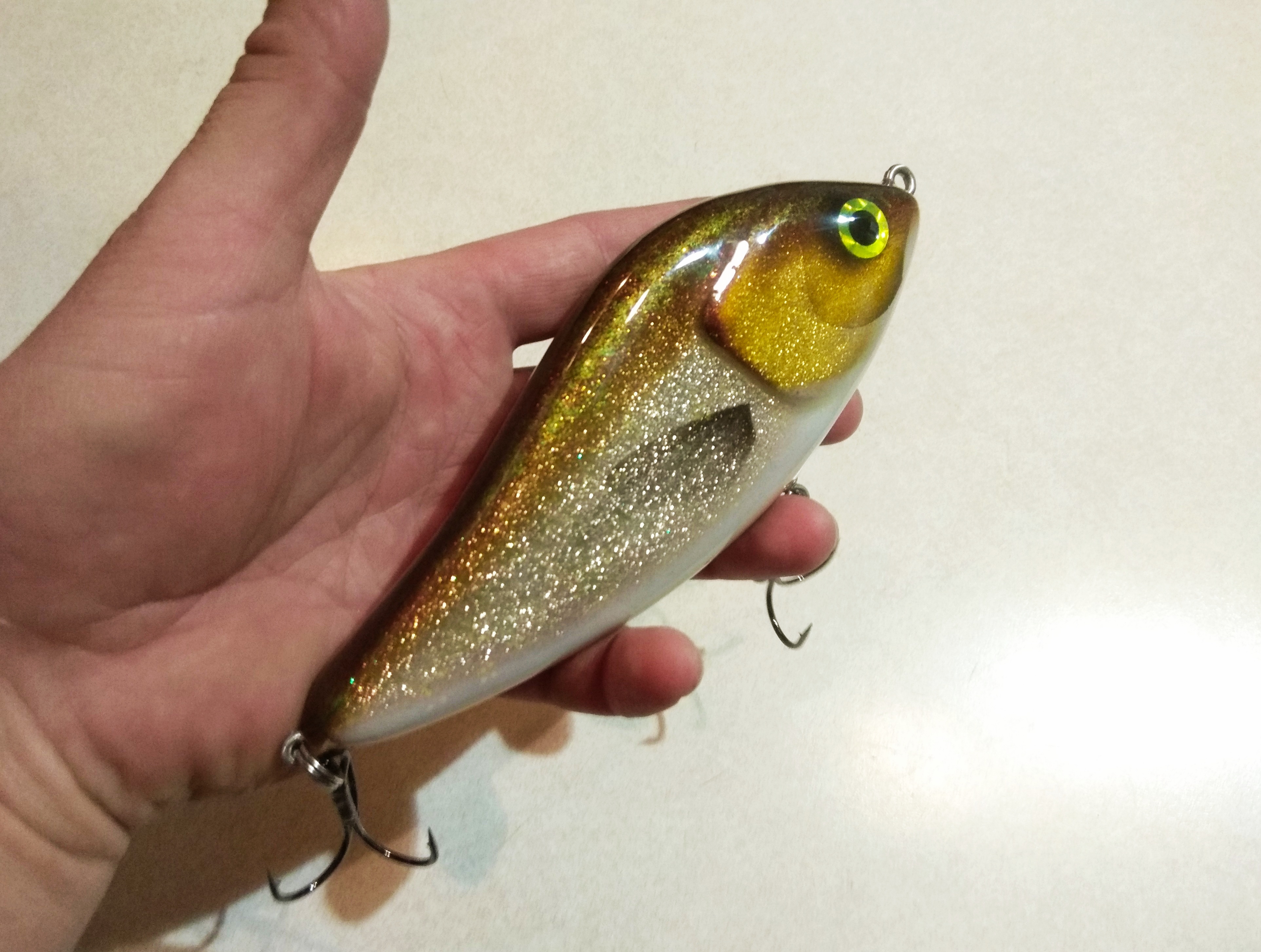 Решил делать в размере 16 см , медленно тонущий , гремящий.Жаберные крышки сделал объемными как на оригинальном джерке. Оговорюсь , джерк вышел не совсем короткоходным и вертлявым , а с глайдами средней длины. Вес джерка с тройниками Owner 2/0 - 125 гр.