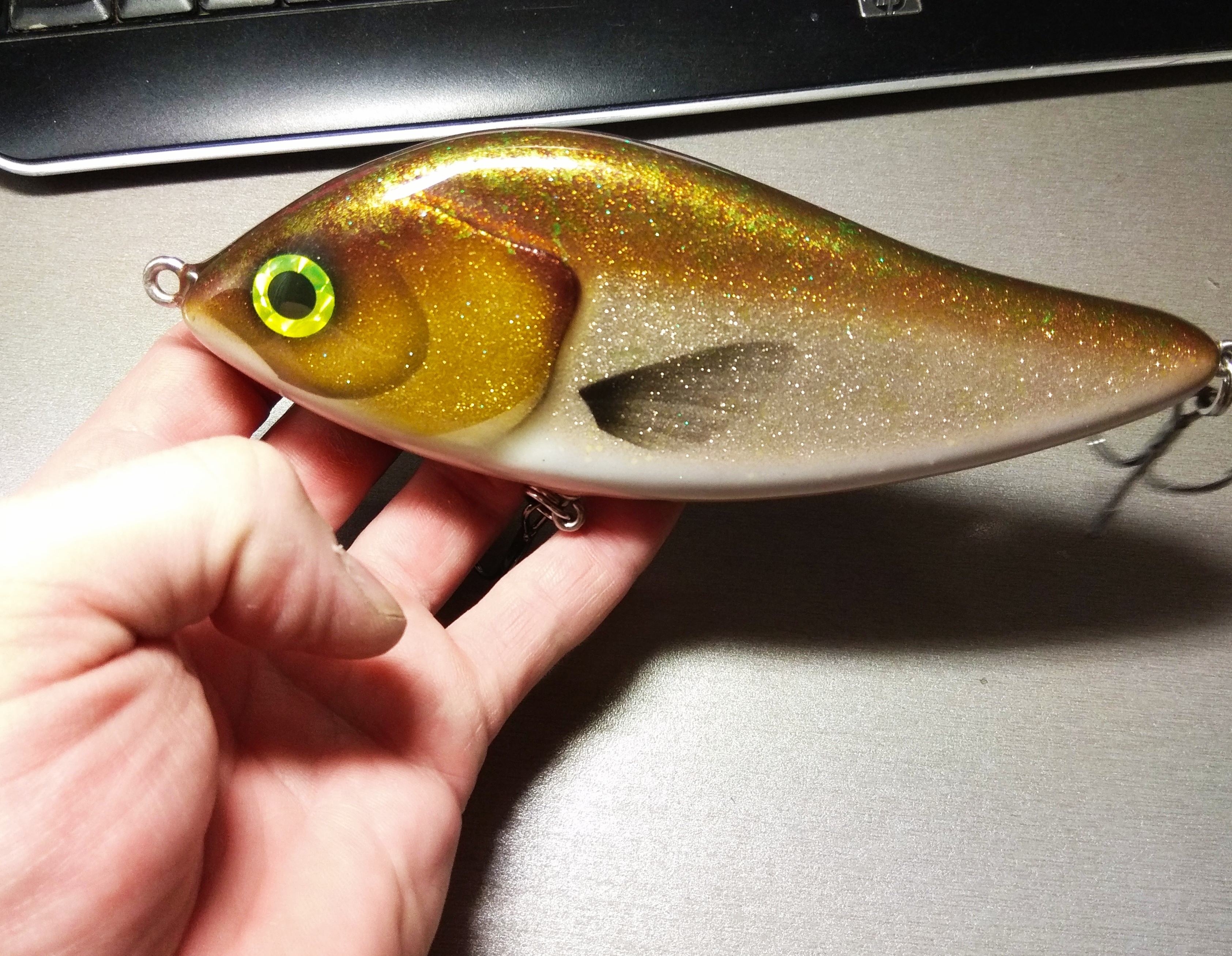 Решил делать в размере 16 см , медленно тонущий , гремящий.Жаберные крышки сделал объемными как на оригинальном джерке. Оговорюсь , джерк вышел не совсем короткоходным и вертлявым , а с глайдами средней длины. Вес джерка с тройниками Owner 2/0 - 125 гр.