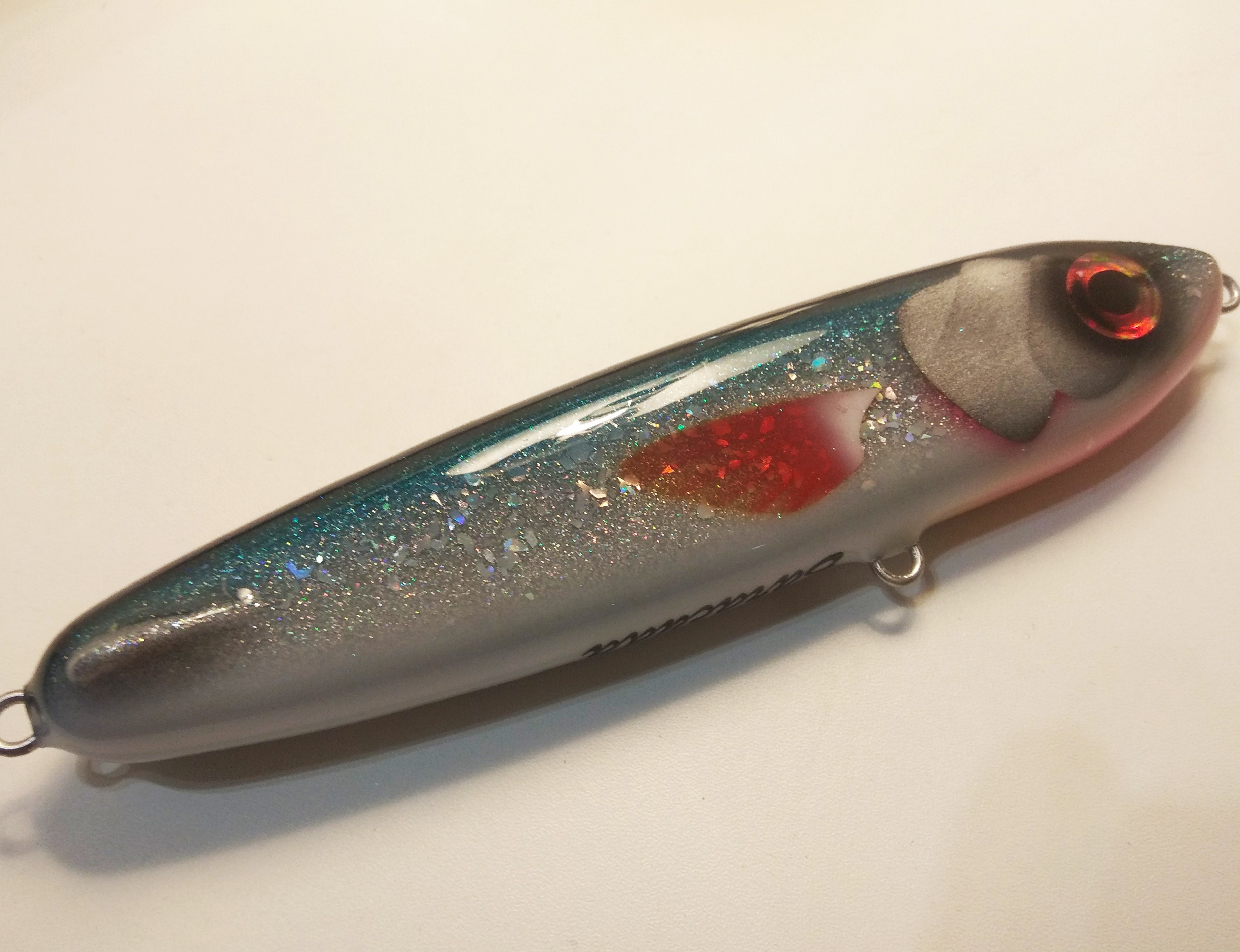 Решил делать в размере 16 см , медленно тонущий , гремящий.Жаберные крышки сделал объемными как на оригинальном джерке. Оговорюсь , джерк вышел не совсем короткоходным и вертлявым , а с глайдами средней длины. Вес джерка с тройниками Owner 2/0 - 125 гр.