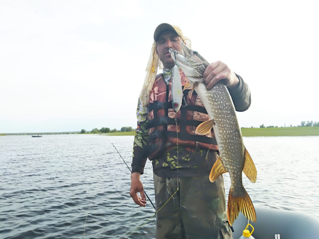 Утро следующего дня возвращает нас в реальность-где она,щука.Опять поиски и перебор приманок.После обеда начинает меняться погода,становится прохладней(первые три дня было за 30 гр.),надвигается фронт.К вечеру подул сильнейший ветер,гроза.дождь.Мы успели скрыться в лагере.Начало смеркаться,дождь успокаивается,гроза заканчивается,а у меня мысли,что надо на воду.Напарник соглашается и мы уже на воде. Встаем на против лагеря и погнали.Чутьё меня не подвело-щука начала отзываться.Внутренний голос подсказывает поставить хвостатого Палыча в цвете Мухамор.Один ударчик,второй и вот она,за кем я приехал сюда за тысячу вёрст.Весы показали 5700. Неплохо.