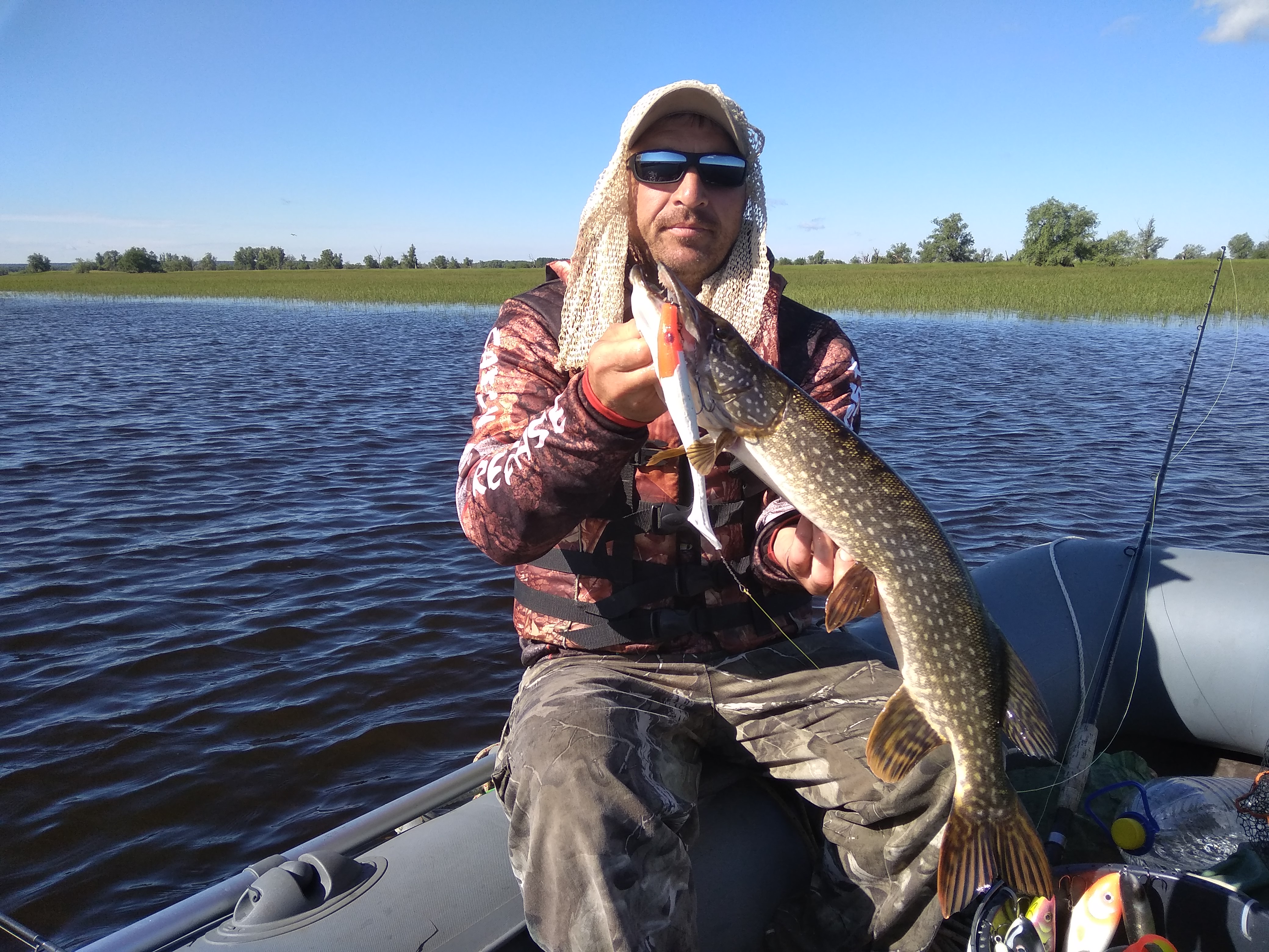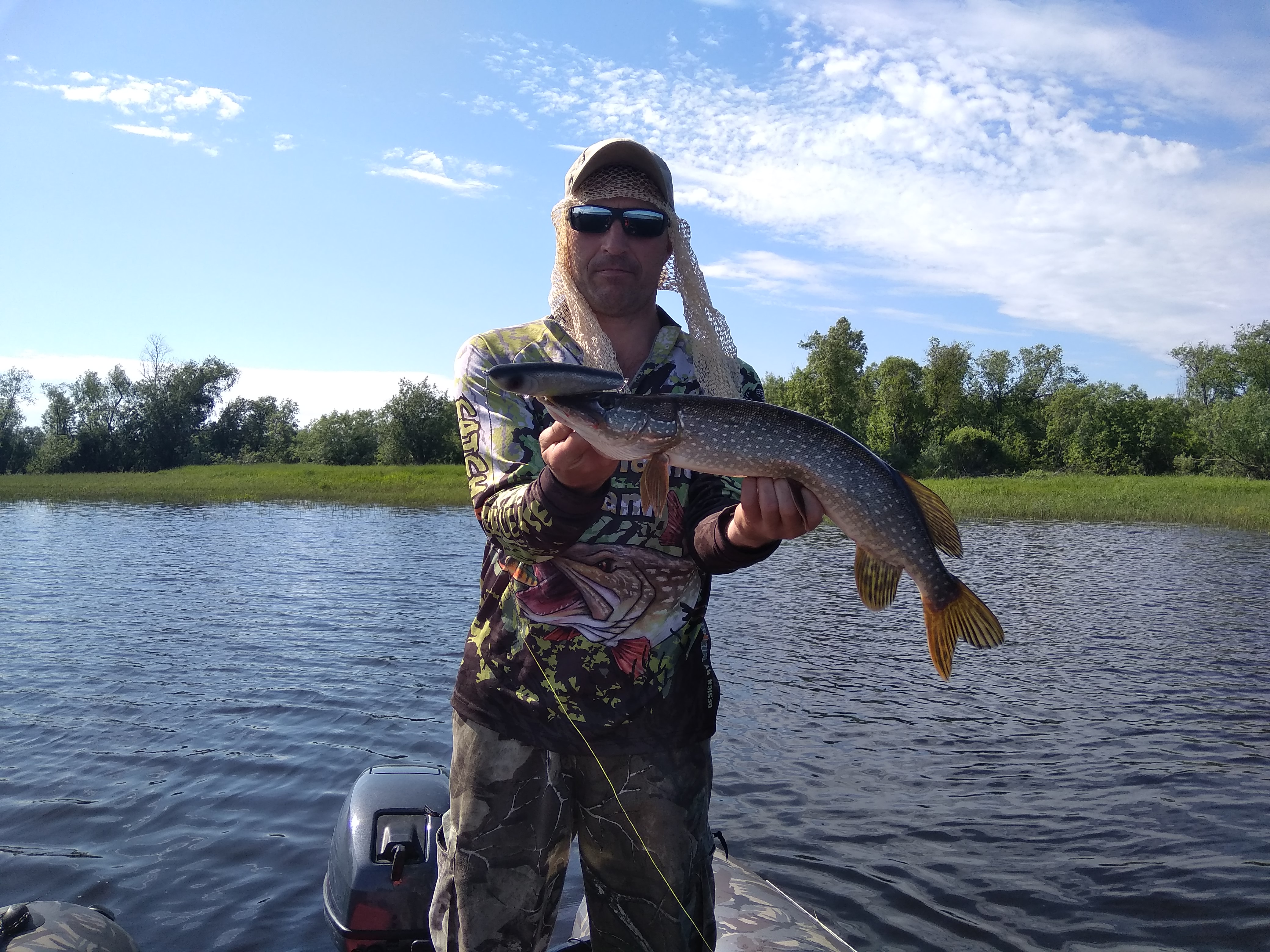 Утро следующего дня возвращает нас в реальность-где она,щука.Опять поиски и перебор приманок.После обеда начинает меняться погода,становится прохладней(первые три дня было за 30 гр.),надвигается фронт.К вечеру подул сильнейший ветер,гроза.дождь.Мы успели скрыться в лагере.Начало смеркаться,дождь успокаивается,гроза заканчивается,а у меня мысли,что надо на воду.Напарник соглашается и мы уже на воде. Встаем на против лагеря и погнали.Чутьё меня не подвело-щука начала отзываться.Внутренний голос подсказывает поставить хвостатого Палыча в цвете Мухамор.Один ударчик,второй и вот она,за кем я приехал сюда за тысячу вёрст.Весы показали 5700. Неплохо.