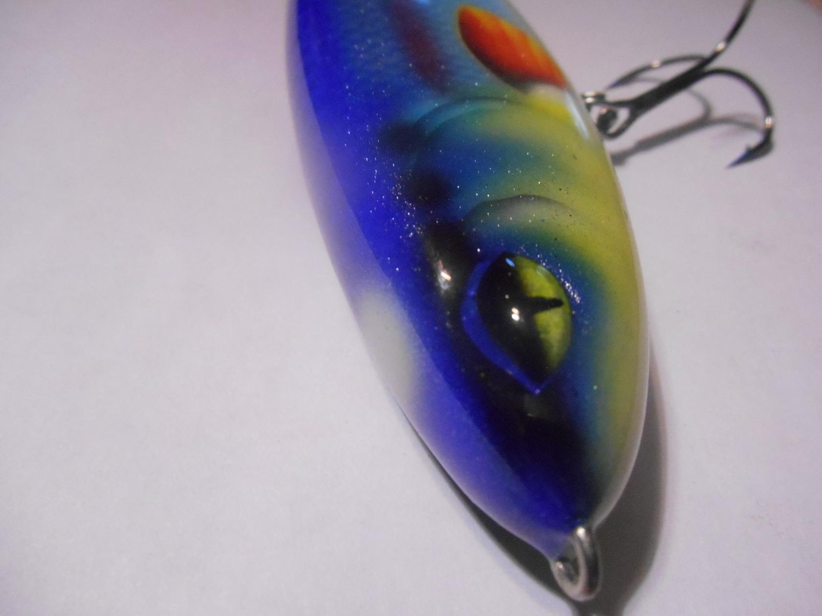 Джерк бейт - Окунь. (Реалистик). Длинна - 160 мм. Медленно тонущий.(Примерно 30 см за 4 секунды). Вес (Без крючков и заводных колец) - 99 грамм.3 слоя финишного покрытия-EnviroTex Lite. Петли-нержавеющая проволока 1.5 мм.